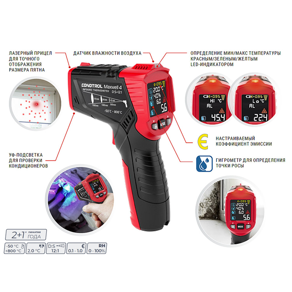 CONDTROL Maxwell 4 – инфракрасный пирометр-гигрометр, позволяющий определить бесконтактным способом температуру поверхности объекта в диапазоне – 30 до + 550 граудсов Цельсия. Подходит для диагностических работ с тепло- и электрооборудованием, контроля и проверки систем кондиционирования, вентиляции и отопления. Он определяет перегрев различных механических и электрических устройств, диагностирует короткое замыкание. В прибор встроен гигрометр, позволяющий измерять температуру среды. Он имеет лазерный прицел на объект, оптимальное оптическое разрешение, крупные цифры, дисплей с подсветкой, сигнализация при превышении граничных значений, компактные размеры и небольшой вес, настраиваемый коэффициент излучения. Пирометр CONDTROL Maxwell 4 – компактный пирометр для быстрого измерения температуры удалённой поверхности, сочетающий в себе функциональность и доступность.