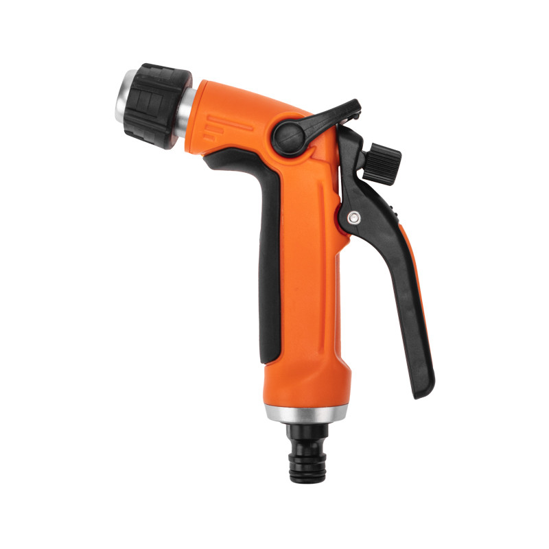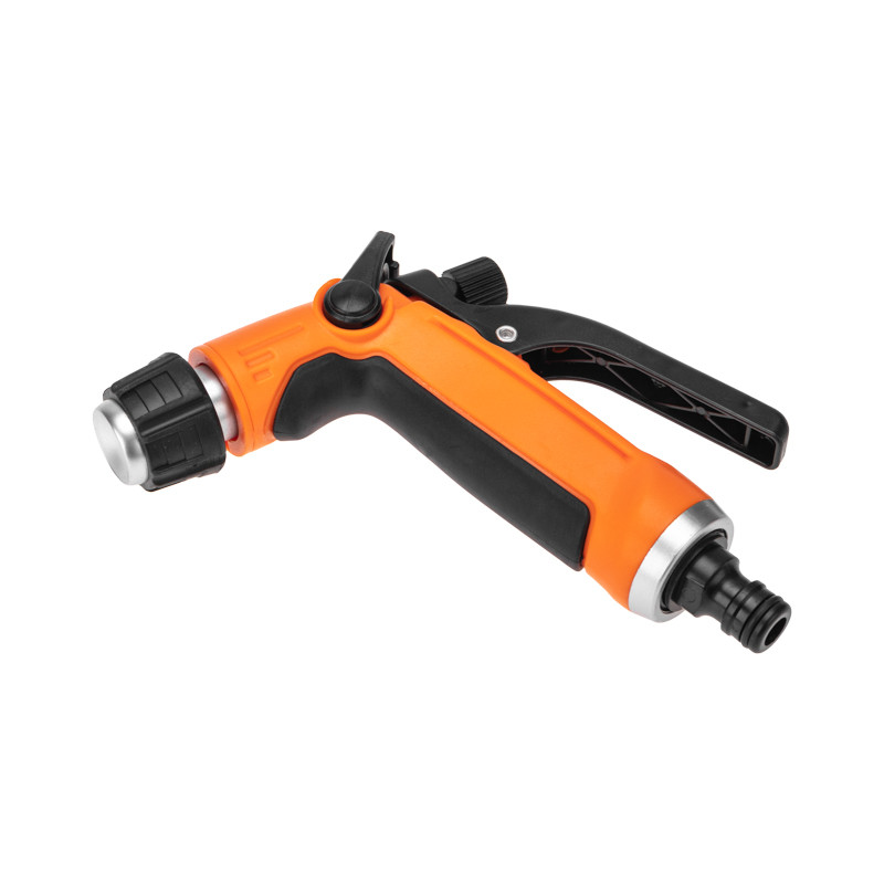 Пистолет представляет собой садовый аксессуар, предназначенный для полива растений и почвы. Выполнен из качественного и прочного пластика, устойчивого к воздействию внешних факторов. Устройство оснащено эргономичной ручкой, благодаря которой пистолет удобно и комфортно держать в руке. Имеет 2 режима подачи воды, регулируемых поворотной головкой. Также на пистолете предусмотрен фиксатор, позволяющий зафиксировать курок и не зажимать его пальцами в процессе полива. Изделие надежно и герметично крепится к шлангу при помощи универсального соединителя, расположенного на конце пистолета.