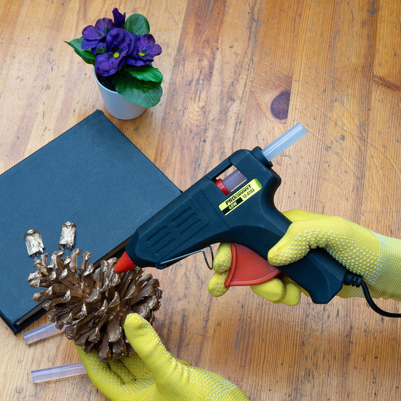 Клеевой пистолет предназначен склеивания поверхностей различных материалов, герметизации стыков и швов, фиксации проводов с помощью расплавленной клеевой массы. Используется в ремонте, декорировании, в изготовлении поделок и моделировании, будет полезен как на производстве, так и в быту. Корпус пистолета изготовлен из ударопрочной пластмассы, поэтому инструмент служит дольше, а металлическая скоба позволяет устанавливать пистолет в режиме ожидания. Сопло пистолета защищено клапаном от произвольного вытекания клея и оснащено термостойким силиконовым протектором, минимизирующим риск ожогов при случайном контакте и защищающим рабочую зону от высокой температуры. Пистолет используется с клеевыми стрежнями диаметром 11 мм.