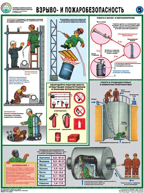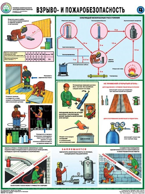 На плакатах Техника безопасности сварочных работ (5 листов, формат А2+, 465х610 мм, ламинация) указаны безопасные расстояния от газовых баллонов и газопроводов до места сварки, открытого огня и электрических кабелей. Приведены примеры оборудования рабочего места сварщика средствами пожаротушения.