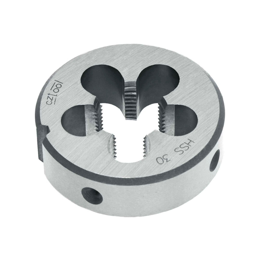 Плашка круглая, используется для нарезания в один проход мелкой и крупной резьбы в винтах, болтах, шпильках, цилиндрах и др. Изготовлена из высококачественной быстрорежущей стали. Предназначена для обработки сплавов из легированной и низколегированной стали с прочностью до 800 Н/мм2 и цветных металлов.