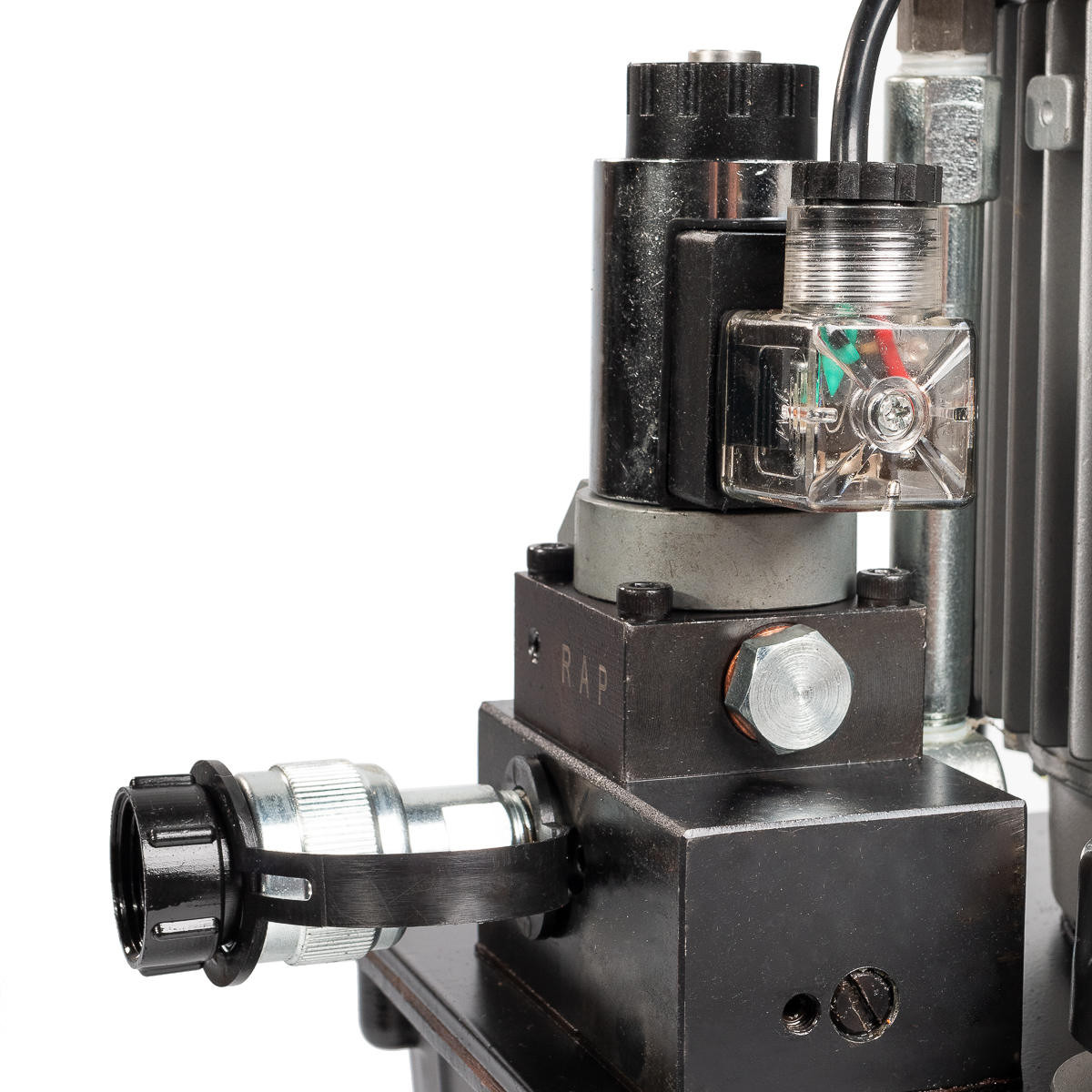 - Электромагнитный трехпозиционный гидрораспределитель работает в режиме «рабочиий ход – удержание – возврат» с возможностью удержания рабочего механизма под нагрузкой (домкраты, трубогибы и т.д.)