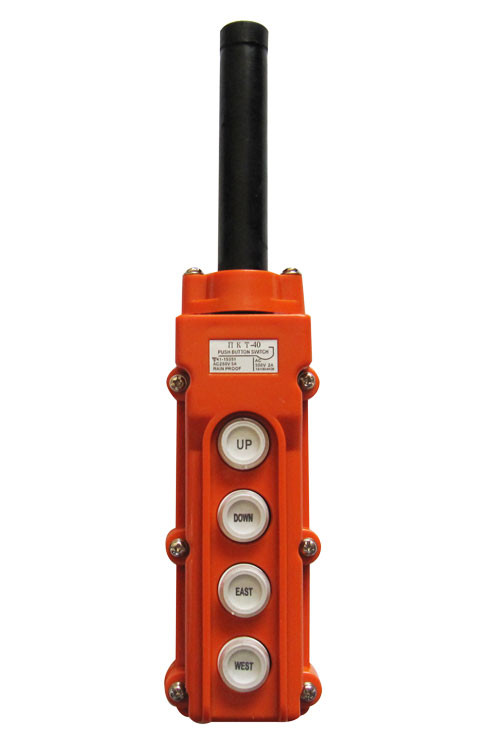 ПКТ-40 пост кнопочный (состоит из четырех кнопок). Посты управления кнопочные серии ПКТ предназначены для дистанционного управления с пола реверсивными и нереверсивными электромагнитными пускателями и контакторами электрических талей с односкоростными и двухскоростными электродвигателями в электрических цепях управления напряжением до 220. Корпус ПКТ выполнен из корболита(черного цвета).