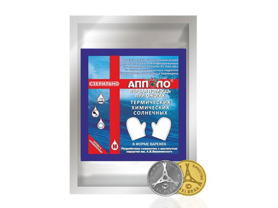 Рукавицы противоожоговые гелевые «АППОЛО» изготовлены из текстильного полотна в форме варежки с нанесенным на неё гидрогелем с включением анилокаина и йодовидона.