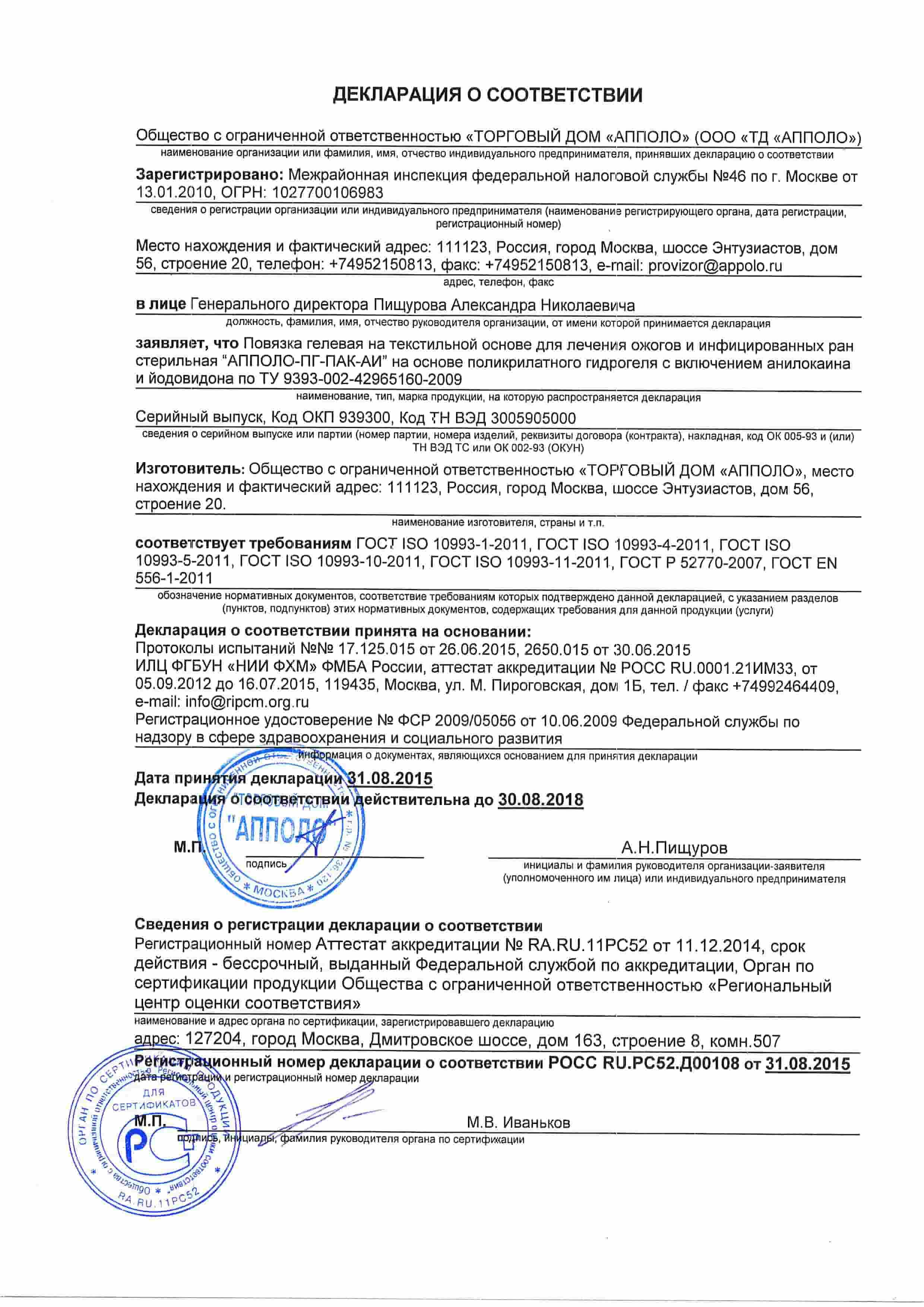 Повязка гелевая на текстильной основе для лечения ожогов и инфицированных ран стерильная «АППОЛО-ПГ-ПАК-АИ» на основе полиакрилатного гидрогеля с включением анилокаина и йодовидона