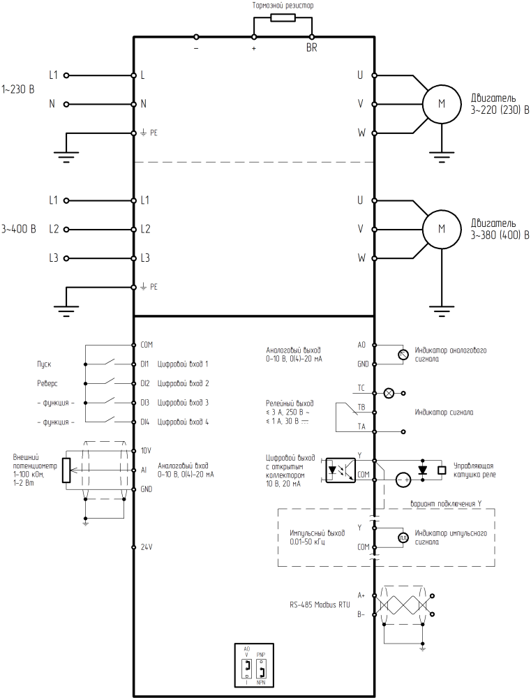 Используются в широком спектре промышленных применений, а также в системах вентиляции и насосных агрегатах. НАСТРОЙКА И ПРОГРАММИРОВАНИЕ -''Быстрый пуск'', Modbus RTU, предустановленные настройки, встроенный пожарный режим, NPN/PNP логика, векторный режим. ЭКСПЛУАТАЦИЯ -поддержка работы с асинхронными и синхронными электродвигателями(СДПМ), ЭМС-фильтр встроен. МОНТАЖ-компактные размеры,установка на DIN-рейку или монтажную панель, установка без воздушных зазоров, бесконечный потенциометр с функцией ввода, как на встроенной(LCD), так и на выносной панели управления(опция). Задание момента -7 типов источников задания вращающего момента. Источник питания 10В DC(10 мА), 24В DC(200мА). Входы управления:4 цифровых(DI), поддерживают PNP/NPN логику, 1 аналоговый(AI) с диапазоном 0…10В или 0/4…20мА. Выходы управления: 1 цифровой (Y) 10 В, 20 мА (можно использовать как импульсный – до 50 кГц), 1 релейный (Т): AC–до 250В, 3.0 А, DC– до 30В, 1А, 1 аналоговый (АО) с диапазоном 0…10В или 0/4…20 мА.