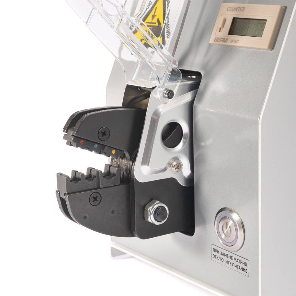 - Краткая характеристика: • Максимальное усилие: 1.6 т; • Время опрессовки: 2 сек; • Счетчик количества опрессовок с ЖК-дисплеем и кнопкой обнуления отсчета; • Защитный прозрачный кожух на губках инструмента; • Напряжение: 230 В/50 Гц; 140 Вт; • Клещи поставляются без матриц