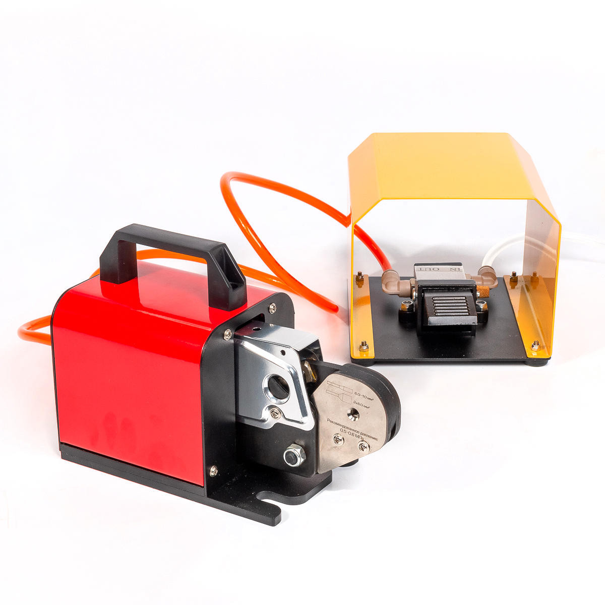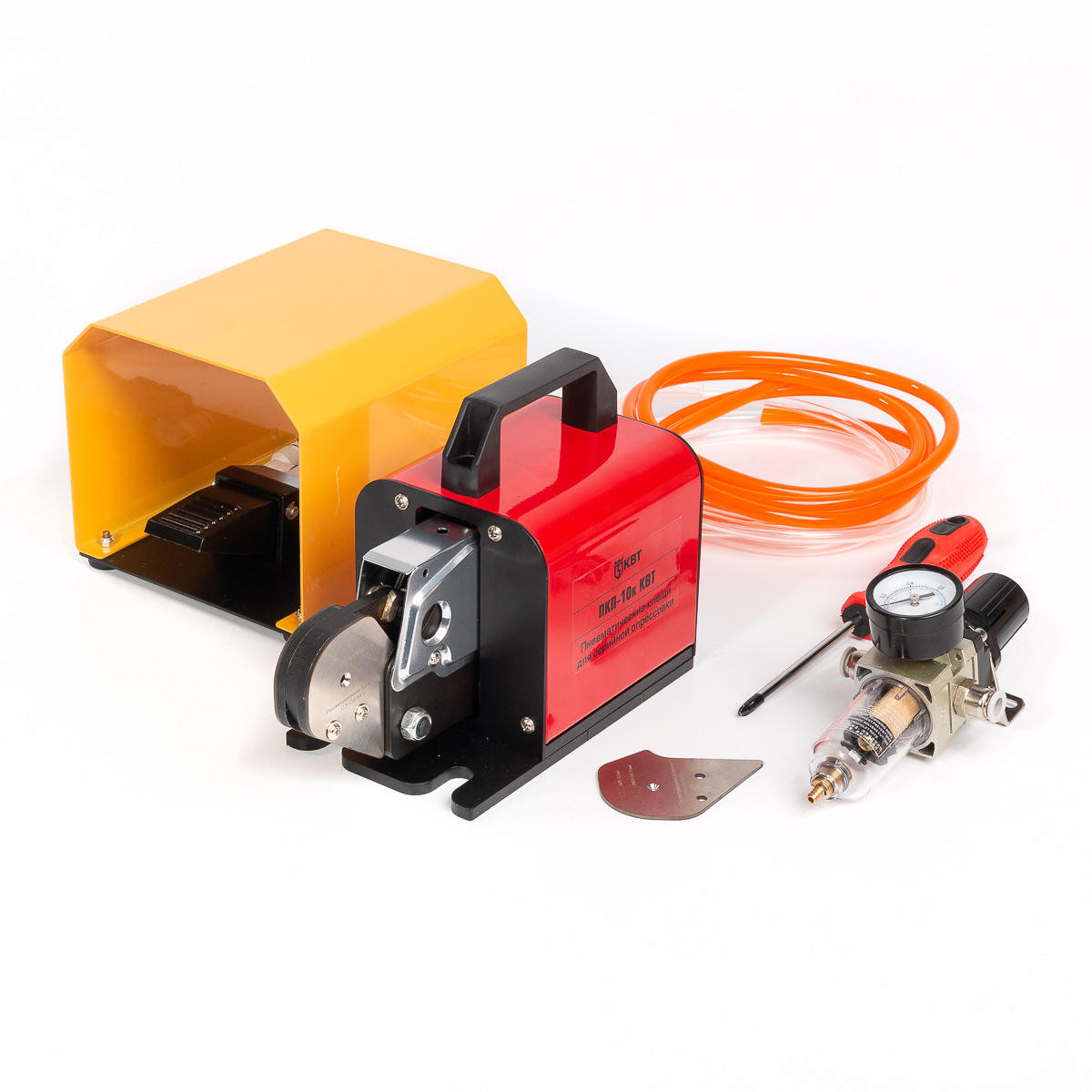 - В комплекте: пневматические клещи, ножная педаль, воздушный шланг, 3 защитных пластины для работы с наконечниками до 1.5 м² / 2.5–4 мм² / 6–10 мм²