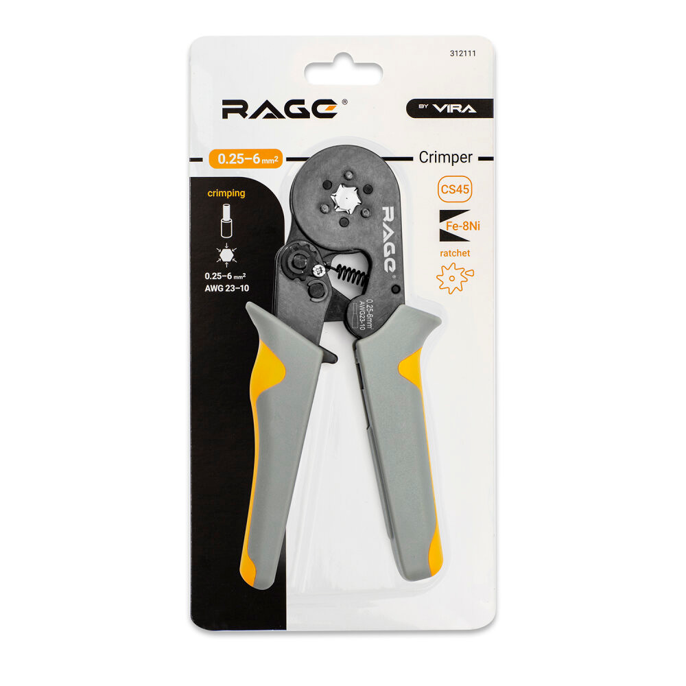 Пресс-клещи типа HSC8 6 - 4A с четырехгранным профилем обжима для наконечников в диапазоне от 0.25 до 10 мм2 от бренда RAGE - универсальный кримпер, который перекрывает широкий диапазон размеров. Корпус кримпера выполнен из прочной стали марки CS45. Пресс-клещи оснащены закругленными линиями корпуса для безопасного применения. Кримпер оснащен саморегулирующейся матрицей с системой поворотных кулачков диафрагменного типа. Обжимные клещи имеют настройку давления опрессовки и принудительно размыкающуюся блокировку, которая не позволяет разойтись рукояткам до полной опрессовки, что позволяет контролировать качество контактного соединения. Для удобства использования пресс-клещи были оснащены удобными эргономичными рукоятками с прорезиненной поверхностью.