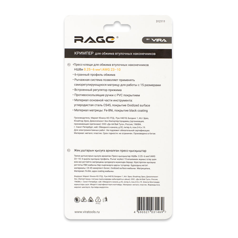Полное описание товара Пресс-клещи шестигранные для обжима наконечников до 6 мм2 (Rage) 312111