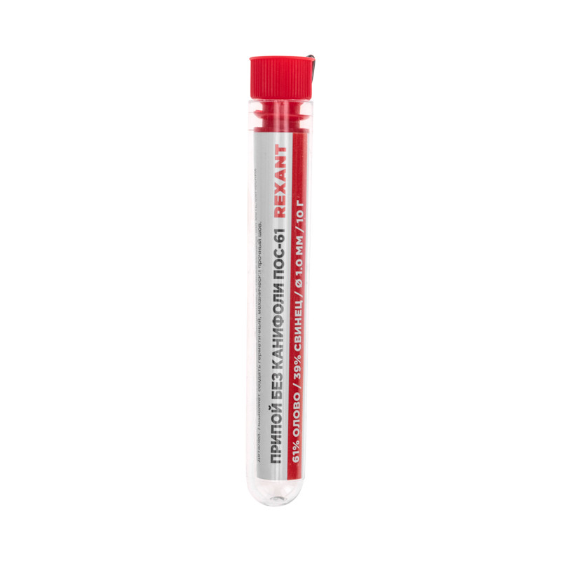 Полное описание товара Припой без канифоли ПОС-61, 10 г, 1.0 мм, (олово 61%, свинец 39%) (REXANT) 09-3093