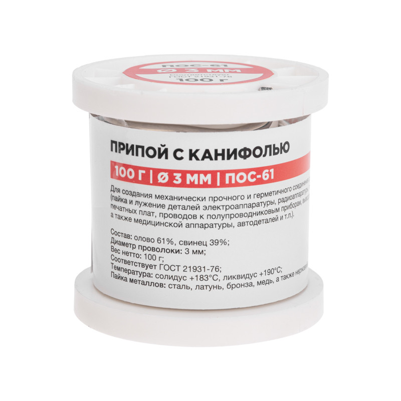 Припой с канифолью ПОС-61, 100г, 3мм, (олово 61%, свинец 39%), катушка (REXANT) 09-3174
