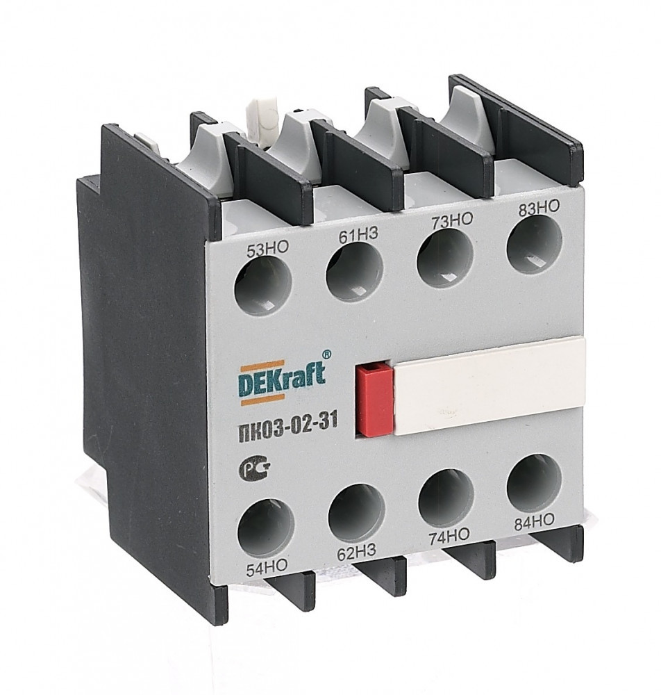 Приставка контактная серии ПК-03-02 для контакторов КМ-103 DEKraft, кол-во контактов - 3НО+1НЗ, ном.ток - 10 А, ном.напряжение - до 690 В, установка - с лицевой стороны, степень защиты - IP20. Приставки контактные предназначены для увеличения количества вспомогательных контактов контактора. Контактные приставки механически соединяются с контакторами и фиксируются при помощи защелки. Приставка подходит для использования с контакторами других производителей.