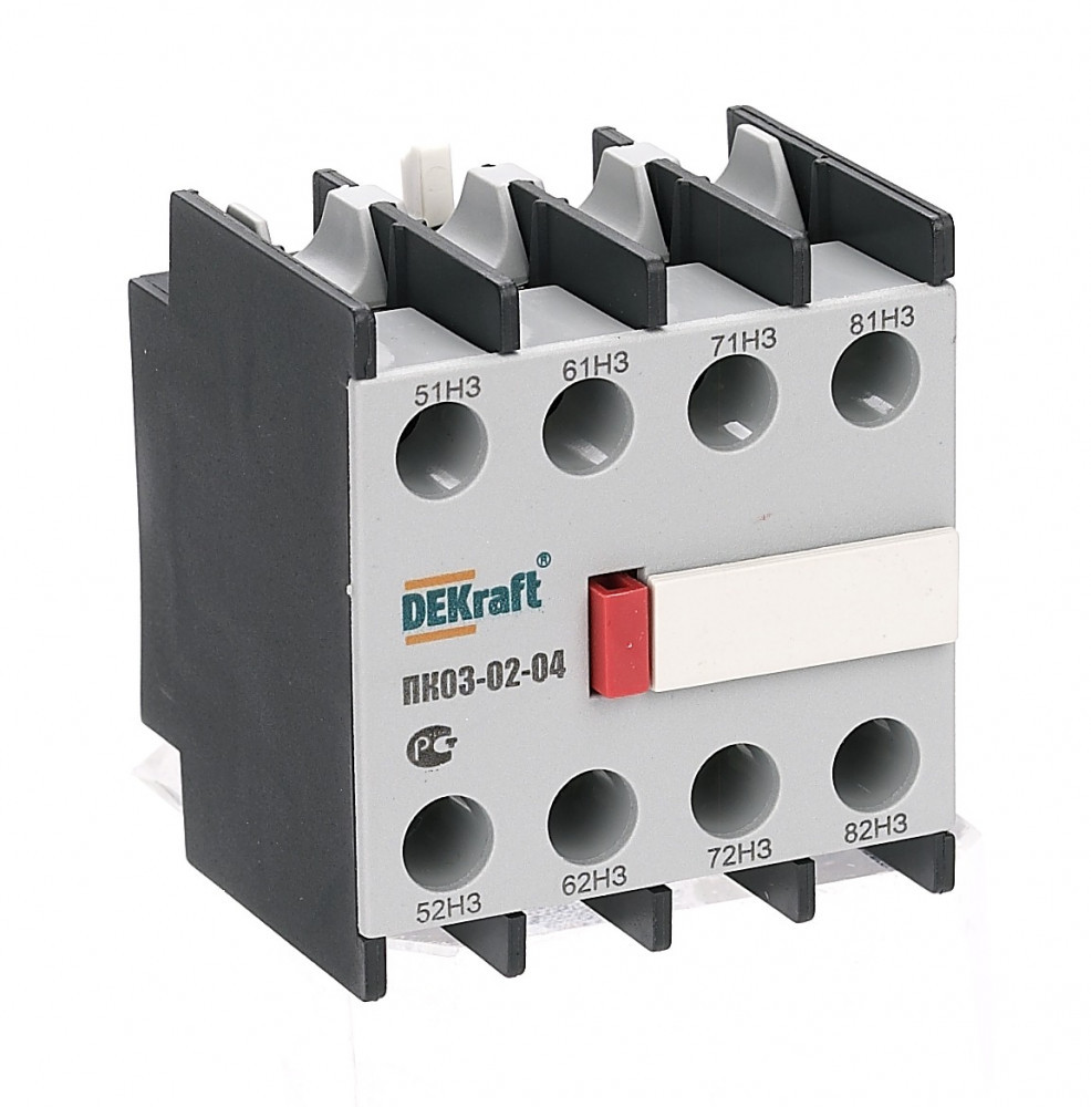 Приставка контактная серии ПК-03-02 для контакторов КМ-103 DEKraft, кол-во контактов - 4НЗ, ном.ток - 10 А, ном.напряжение - до 690 В, установка - с лицевой стороны, степень защиты - IP20. Приставки контактные предназначены для увеличения количества вспомогательных контактов контактора. Контактные приставки механически соединяются с контакторами и фиксируются при помощи защелки. Приставка подходит для использования с контакторами других производителей.
