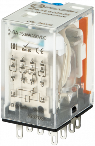 Промежуточное реле, 4 перекидных контакта 6А, 24В (DC), блокируемая кнопка проверки, светодиод (Релеон) RP434902405