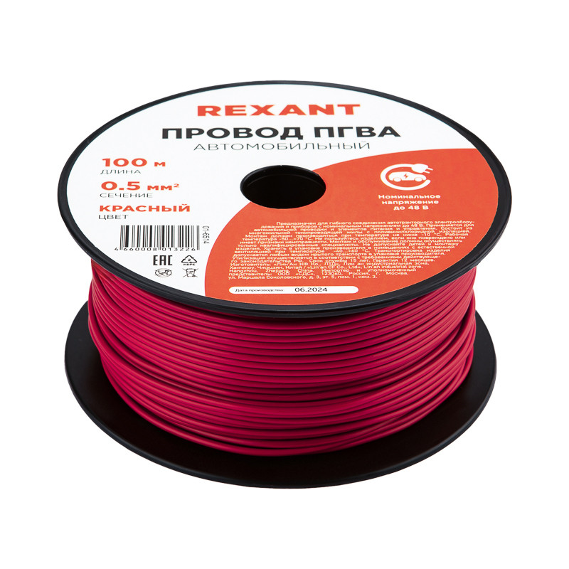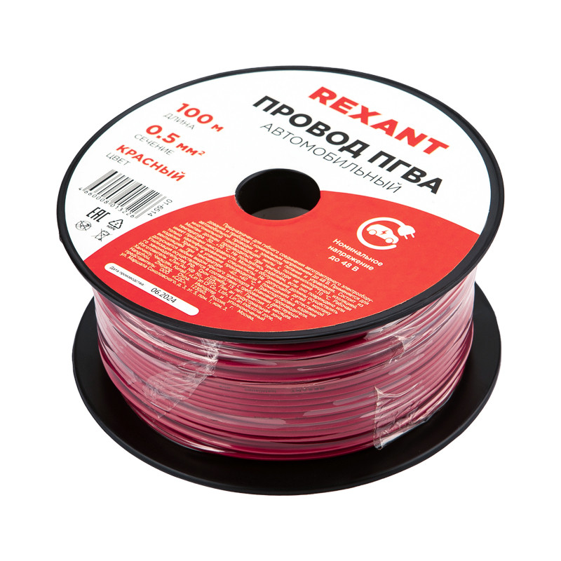 Провод ПГВА REXANT предназначен для гибкого соединения автотракторного электрооборудования и приборов с номинальным напряжением до 48 В, изготавливается для автомобильной проводки и элементов питания и управления. Состоит из многожильной токопроводящей жилы с поливинилхлоридной изоляцией.