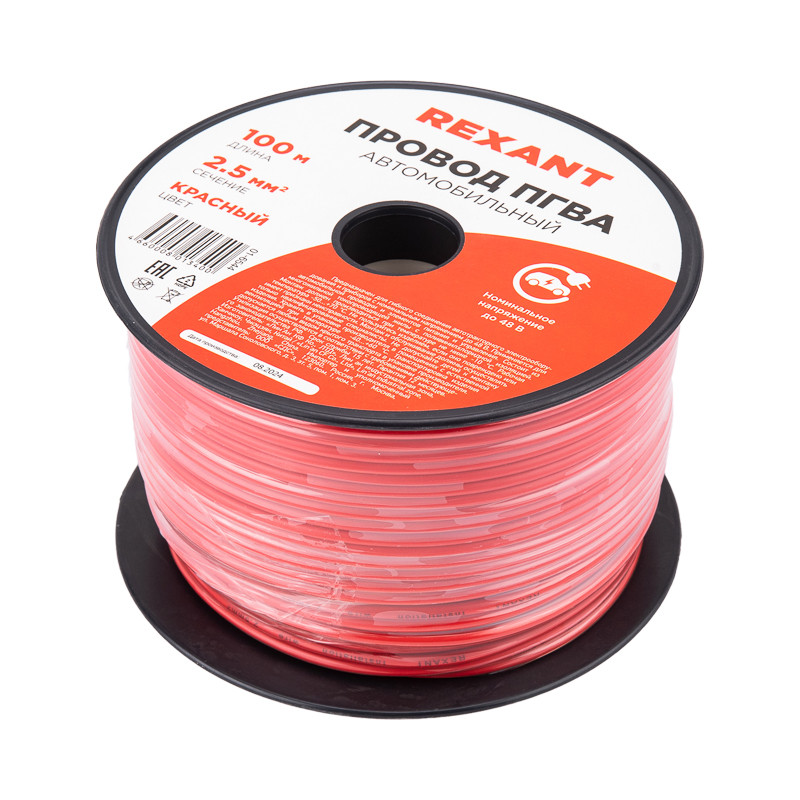 Полное описание товара Провод ПГВА 1х2.50 мм2, красный, бухта 100 м, (REXANT) 01-6544