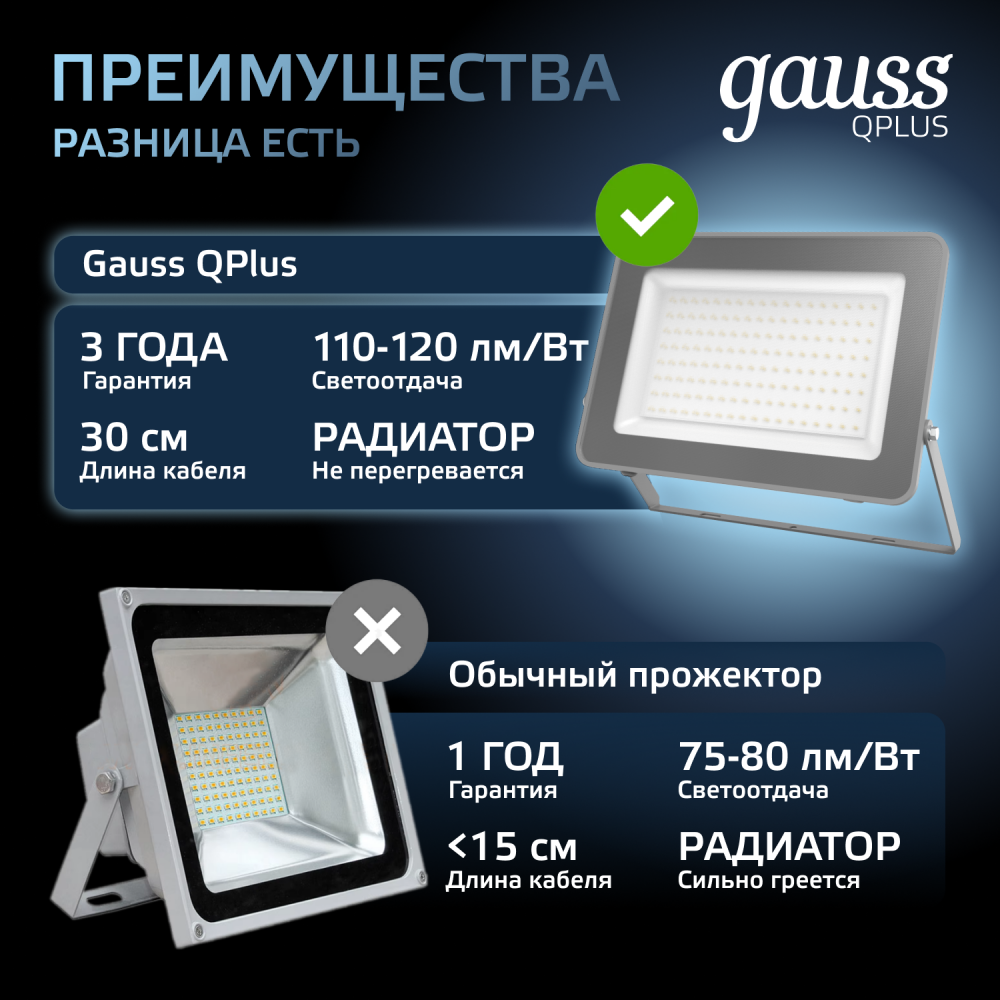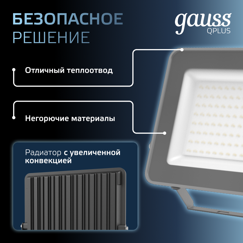 Светодиодные прожекторы Gauss серии Qplus в новом эксклюзивном цвете ''графит'' предназначены для освещения крупногабаритных помещений и объектов, требующих мощной подсветки. Это могут быть производственные или спортивные площадки, автостоянки, а также фасады зданий. Корпус прожектора Qplus Графит изготовлен из прочного литого алюминия, рассеиватель микропризма выполнен из закаленного стекла. Экономичная LED технология сокращает до 90% затрат на электроэнергию, а технология LCT продлевает жизнь светодиодам за счет пониженной подачи напряжения 60% от номинальной. Использование надежного нелинейного интегрированного драйвера гарантирует работу практически в любых условиях, отсутствие электромагнитных помех и высокий коэффициент мощности более 0,9. Материалы изготовления и конструкция прожекторов Qplus обеспечивают их высокую механическую прочность и полную защиту от пыли и влаги по классу IP65. Для удобства использования и монтажа, светильники оснащены силиконовым кабелем длиной 30 см.