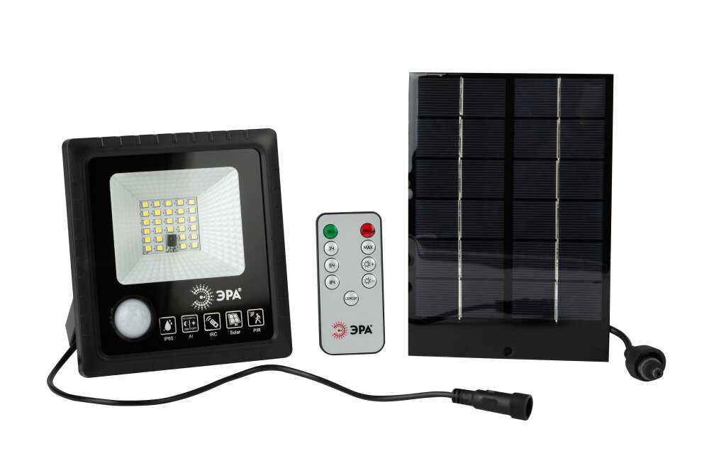 Cветодиодный уличный прожектор ЭРА ERAPRO-20 на солнечных батареях имеет высокую защиту от влаги и пыли (IP65) и функционирует в широком температурном диапазоне (от - 20 до + 50 градусов). В модель встроен морозоустойчивый сменный литий-ионный аккумулятор. Солнечная панель входит в комплект. Время полного заряда составляет 8 часов. В качестве источников света используются сверхъяркие светодиоды последнего поколения в количестве 28 штук. В прожекторе установлен датчик движения - освещение будет включено только в тот период, когда рядом находятся люди. Время до перехода в дежурный режим составляет 30 секунд. Датчик движения имеет возможность отключения. В комплекте поставляется пульт дистанционного управления, который позволяет на расстоянии включать и выключать свет, отключать датчик движения, устанавливать таймер работы, регулировать яркость.