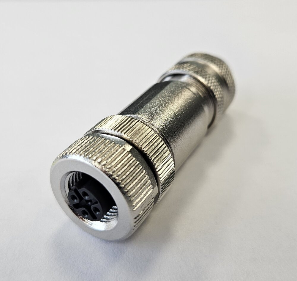 Коннектор кабельный герметичный СЦМ120001-04A IP68 c 4 гнездовыми контактами, кодировка А, прямой металлический корпус, предназначен для соединения и распределения электрических проводников, которым требуется обеспечить полную герметичность и защиту кабеля. Имеет винтовой тип зажима. Диаметр кабеля 6 мм