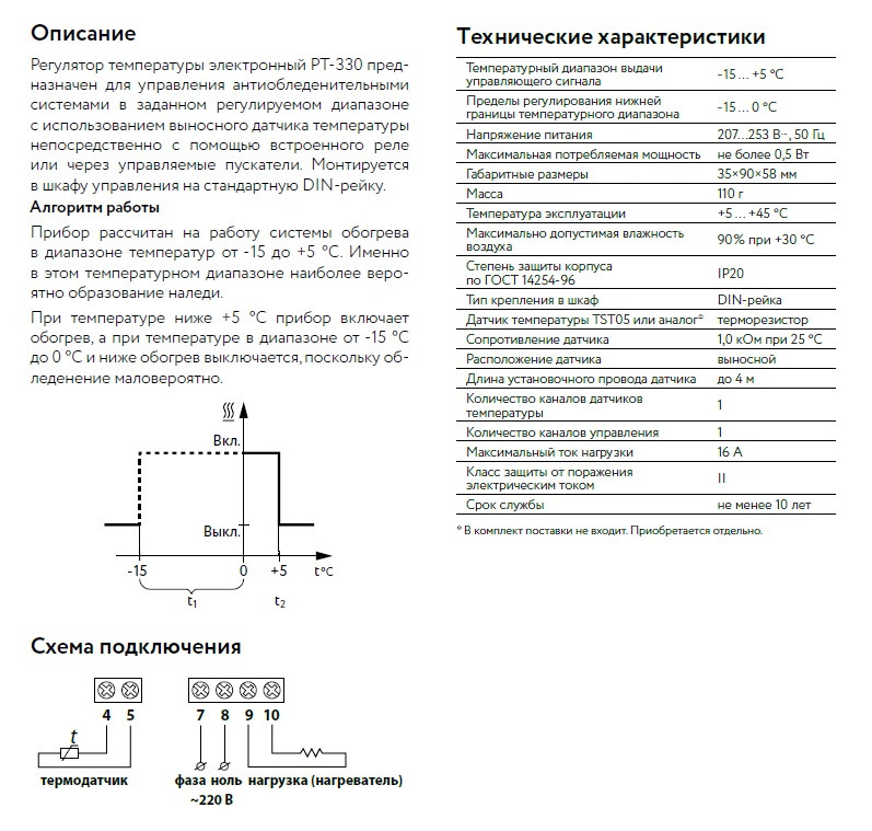 - Преимущества: Простота эксплуатации|Компактные размеры|Самостоятельная коммутация контактов до 16 А|Регулируемый температурный диапазон включения обогрева для предотвращения образования наледи|Индикация включенного состояния и состояния нагрева|Сохранение параметров в энергонезависимой памяти