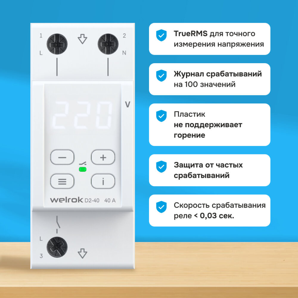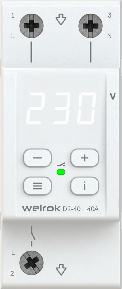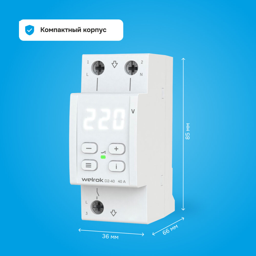 D2 защищает оборудование от скачков и провалов напряжения, обрыва нулевого провода. Реле отключает нагрузку, если сетевое напряжение выходит за установленные пределы. Когда значение напряжения вернется в норму, нагрузка будет автоматически включена обратно. На все реле напряжения Welrok действует 10-летняя гарантия от производителя. Для уменьшения количества срабатываний: - Защита от частых срабатываний - Регулируемый гистерезис - Регулируемая задержка включения нагрузки - Профессиональная модель отключения при выходе напряжения за пределы/ Для комфортной и безопасной эксплуатации: - Поправка напряжения на экране - Регулировка яркости экрана - Защита от перегрева - Корпус реле напряжения изготовлен из пластика, не поддерживающего горение.