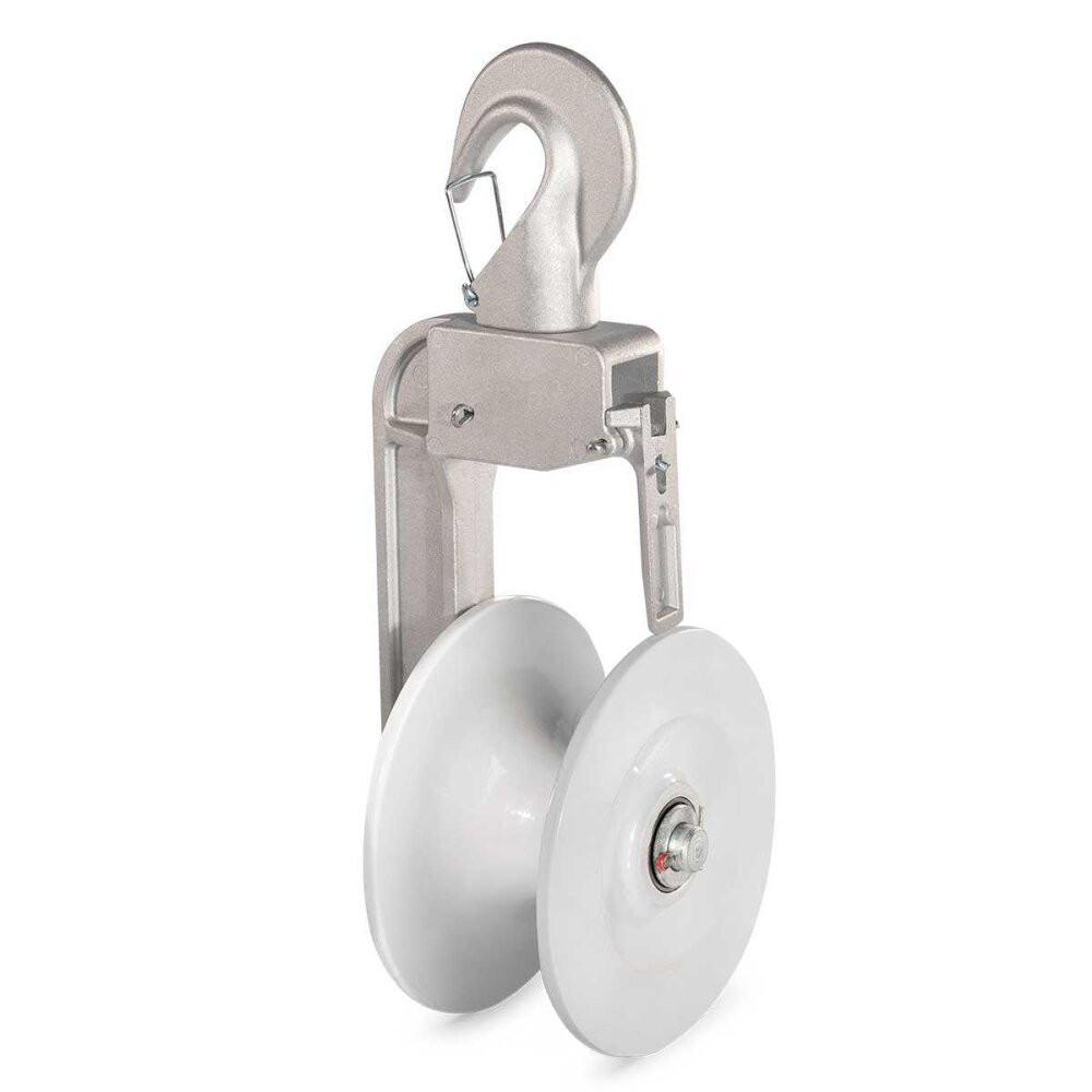 - Краткая характеристика: • Диск ролика и подвесной кронштейн из прочного и легкого алюминиевого сплава; • Крепление на опоре осуществляется при помощи крюка с фиксатором; • Поворотный крюк, на котором установлена рамка монтажного ролика позволяет проходить угловые участки кабельных трасс с углом поворота до 30°; • Максимальный диаметр кабеля: 50 мм; • Максимальная нагрузка: 6 кН