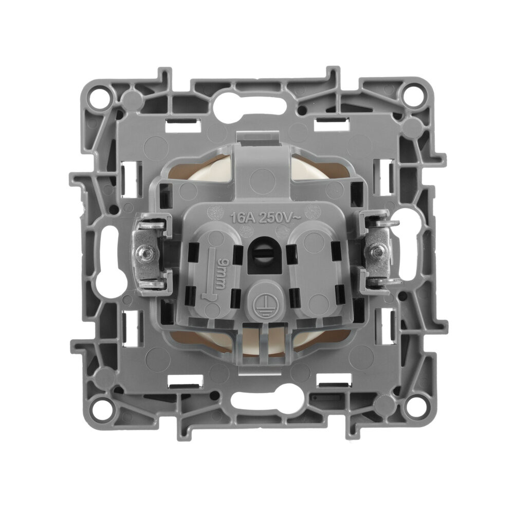Розетка без заземления ETIKA для скрытого монтажа. Максимальный ток 16 А, максимальная мощность 3680 Вт. Применяется в зданиях с проводкой без заземления (без защитного проводника).
