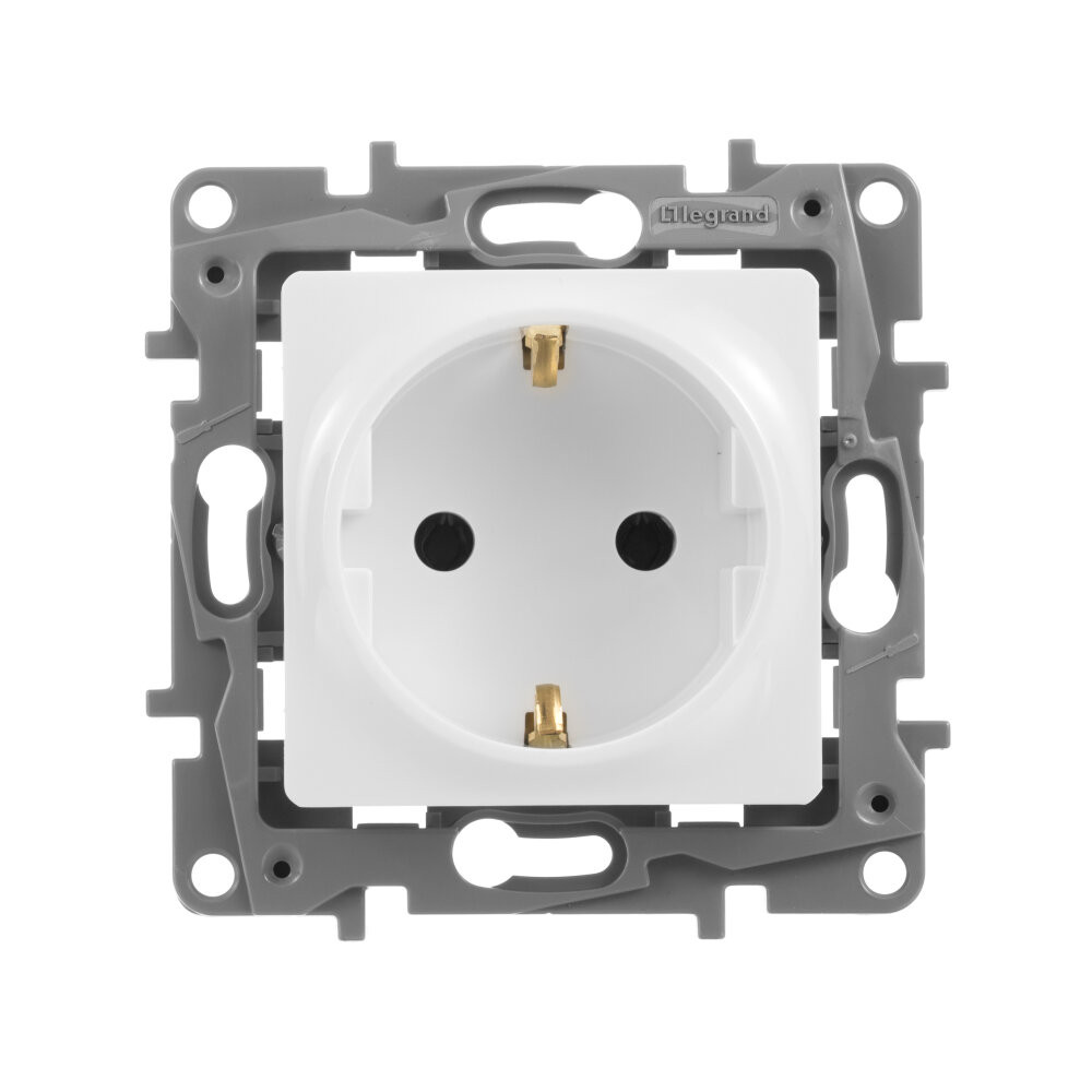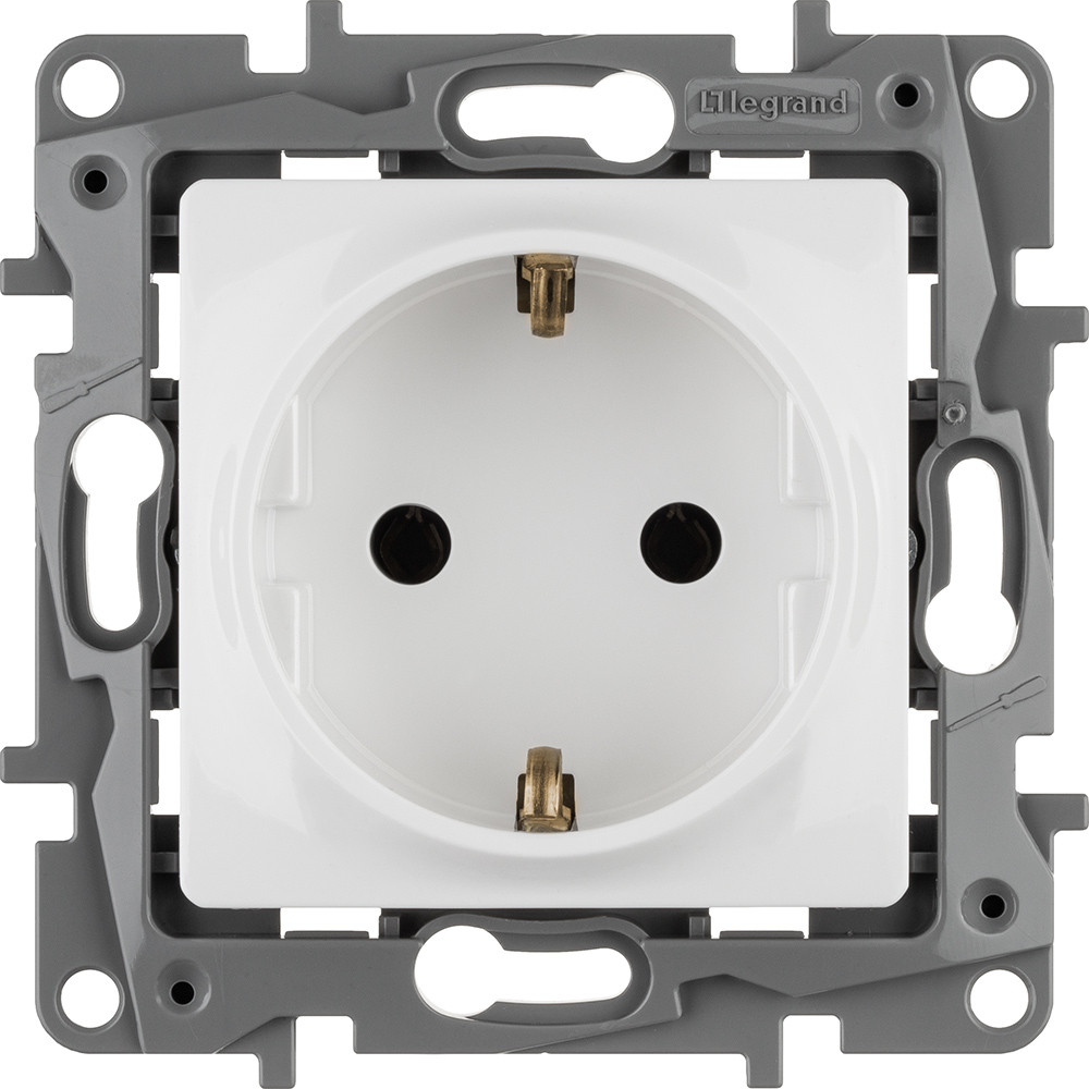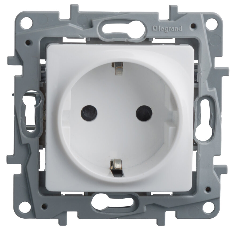 Розетка с заземлением ETIKA для скрытого монтажа. Максимальный ток 16 А, максимальная мощность 3680 Вт. Применяется в зданиях, оборудованных для повышения безопасности проводкой с заземлением (с защитным проводником).