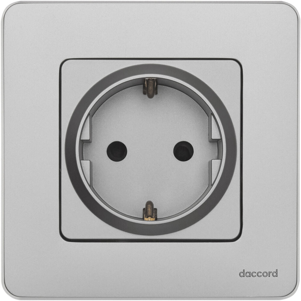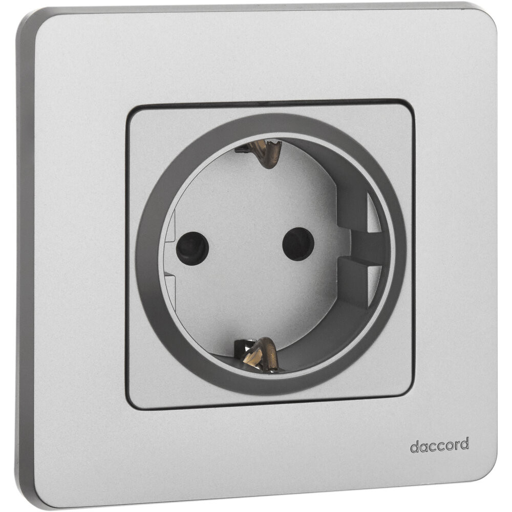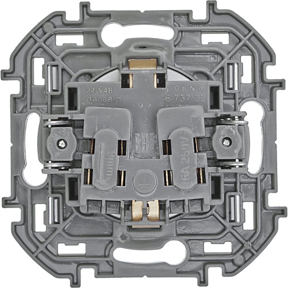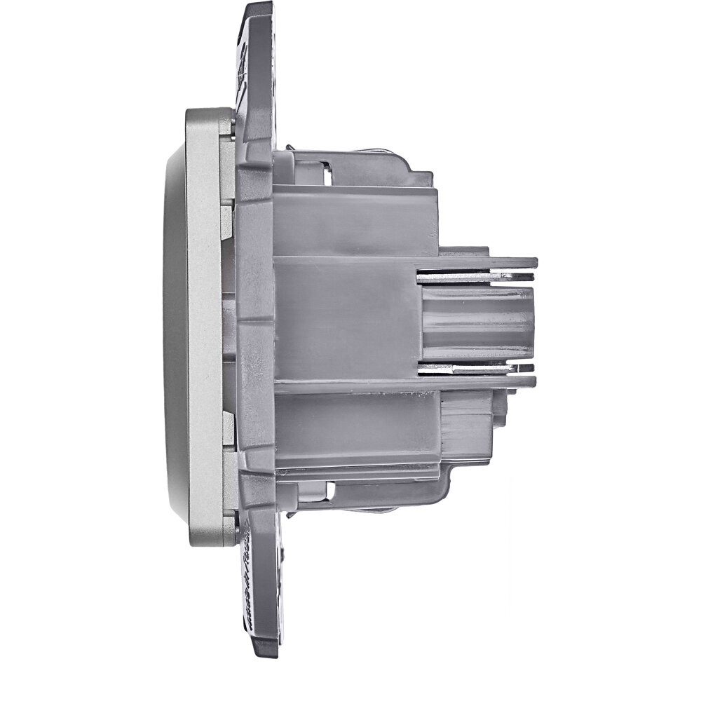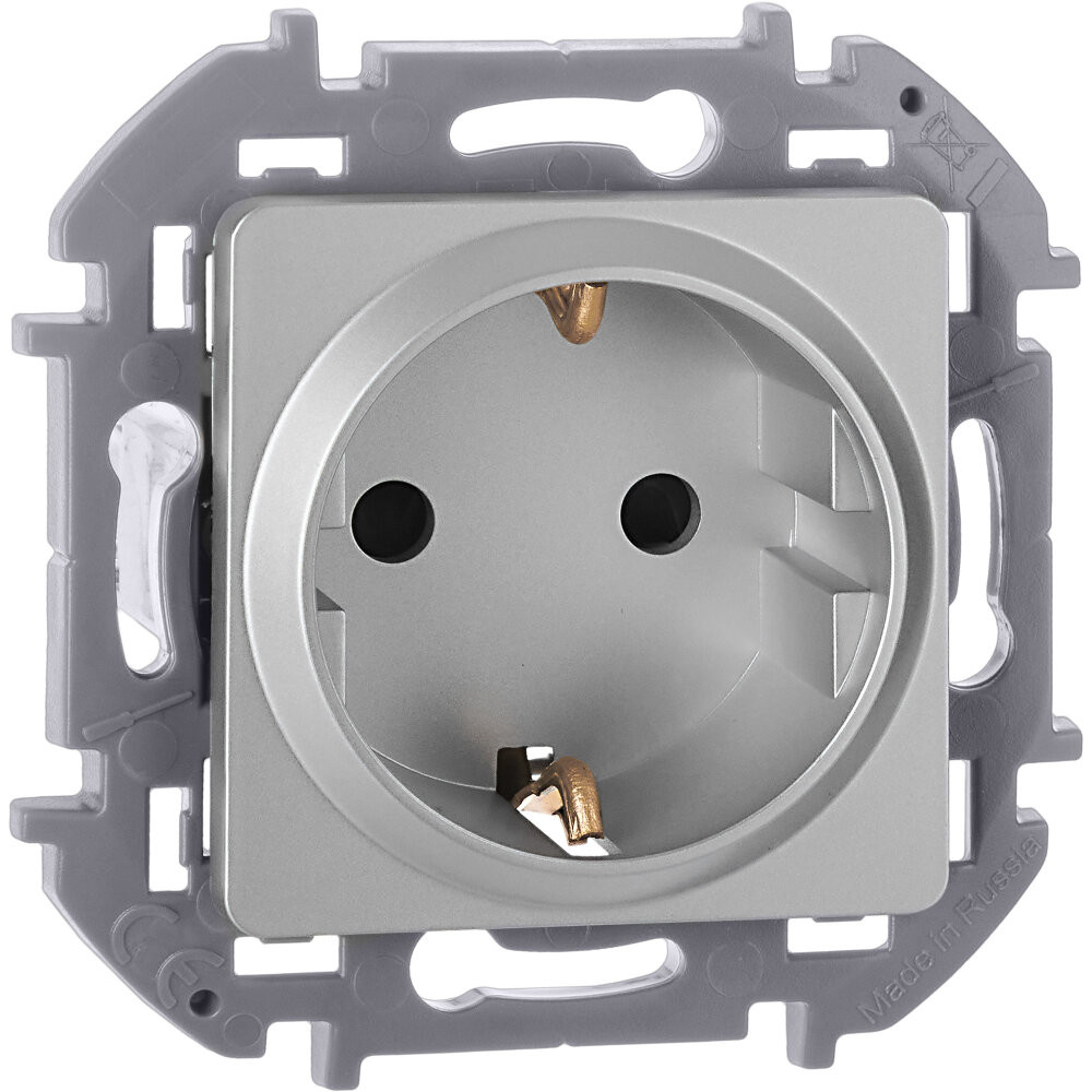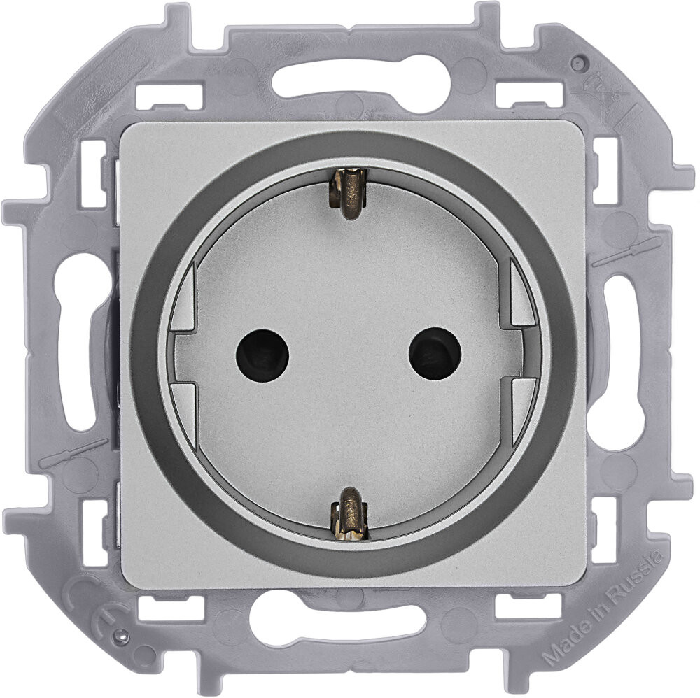Розетка с заземлением, с защитными шторками для скрытого монтажа Inspiria, цвет ''Алюминий'', максимальный ток 16А, напряжение ~250В, максимальная мощность 3680Вт, винтовые зажимы. Применяется для присоединения однофазных электрических потребителей к сети переменного тока в зданиях с проводкой с заземлением (с защитным проводником).