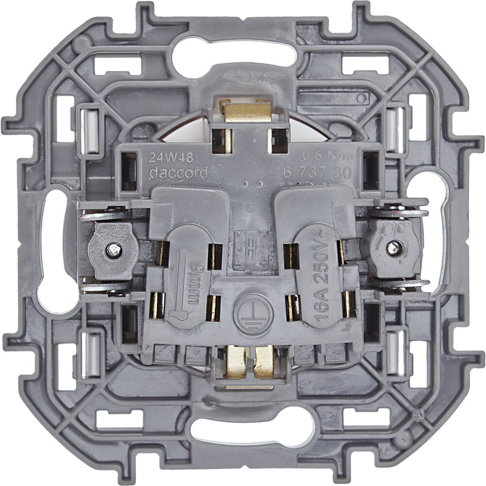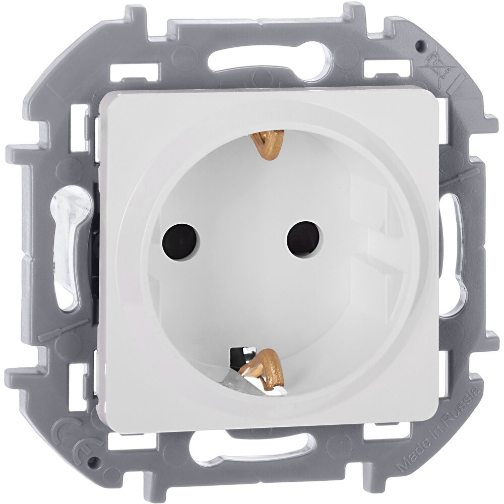 Розетка с заземлением, с защитными шторками для скрытого монтажа Inspiria, цвет ''Белый'', максимальный ток 16А, напряжение ~250В, максимальная мощность 3680Вт, винтовые зажимы. Применяется для присоединения однофазных электрических потребителей к сети переменного тока в зданиях с проводкой с заземлением (с защитным проводником).