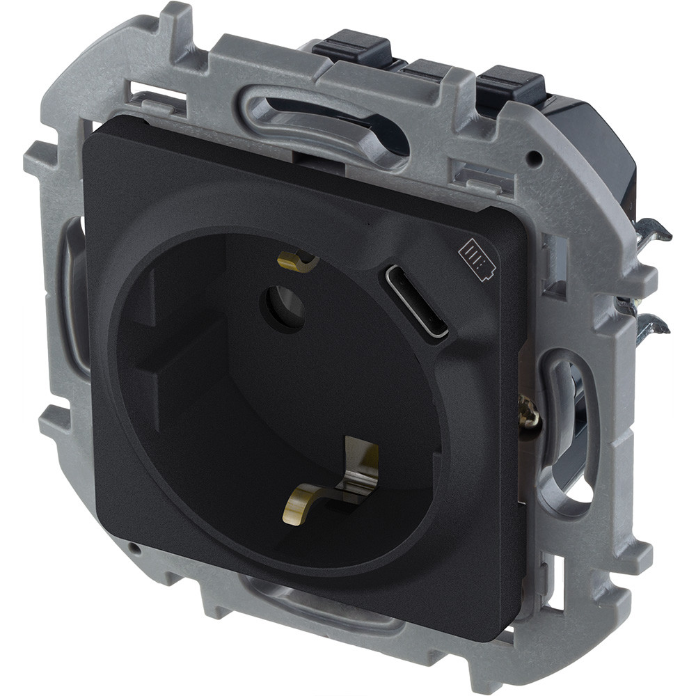 Комбинированная розетка 2К+З с зарядным устройством USB тип С Inspiria для скрытого монтажа, цвет ''Антрацит''. Максимальный ток розетки 16АХ, напряжение розетки ~250В, напряжение зарядного устройства -5В, максимальный зарядный ток 1500 мА. Применяется для одновременного электропитания бытовых потребителей и зарядки мобильного устройства. Оснащена интегрированными шторками, которые защищают детей и других пользователей от удара электрическим током.