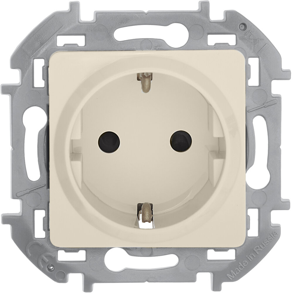 Розетка с заземлением, с защитными шторками для скрытого монтажа Inspiria, цвет ''Слоновая кость'', максимальный ток 16А, напряжение ~250В, максимальная мощность 3680Вт, винтовые зажимы. Применяется для присоединения однофазных электрических потребителей к сети переменного тока в зданиях с проводкой с заземлением (с защитным проводником).