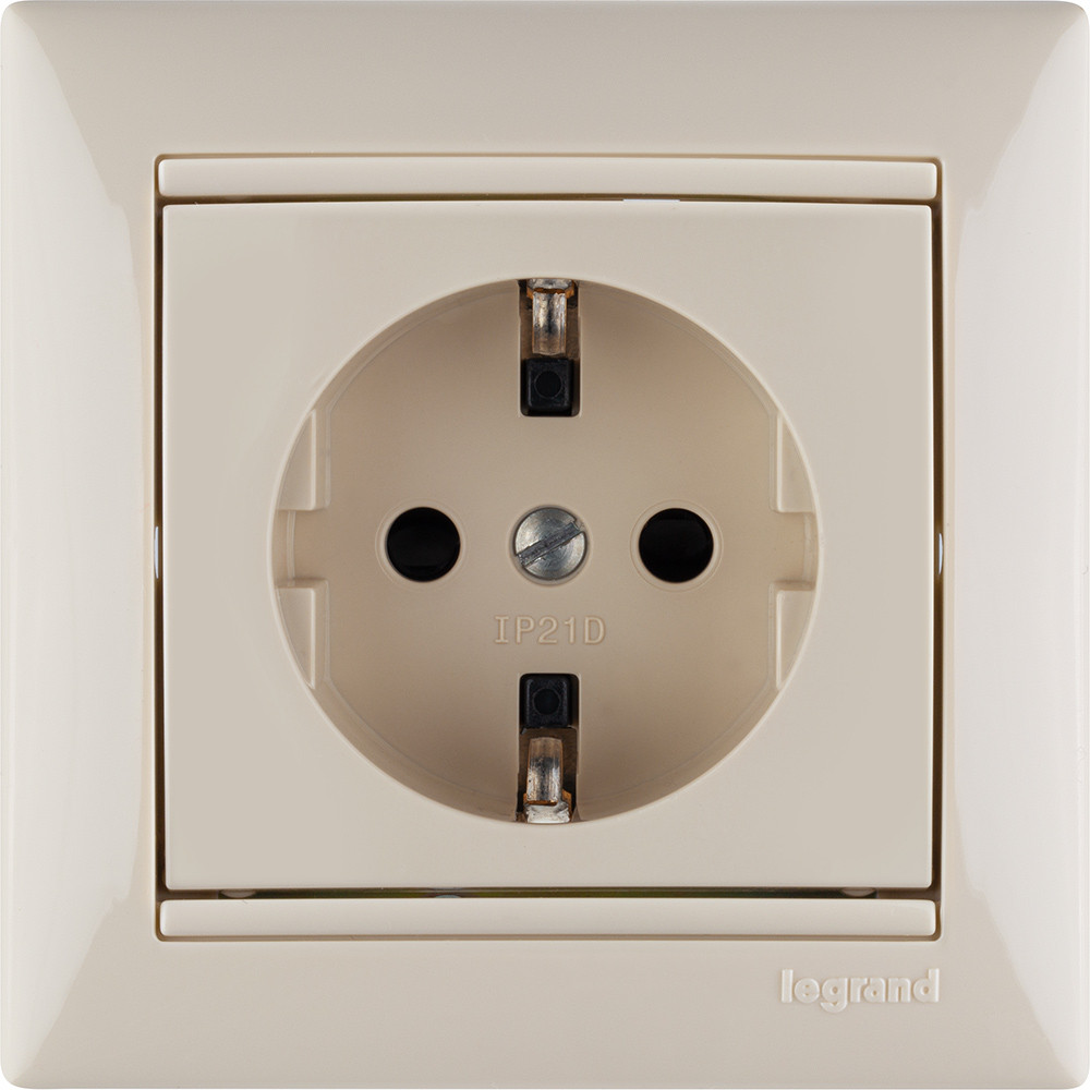 Розетка с заземлением с защитными шторками VALENA для скрытого монтажа. Максимальный ток 16 А, максимальная мощность 3680 Вт. Применяется в зданиях, оборудованных для повышения безопасности проводкой с заземлением (с защитным проводником). Рекомендуются к применению в помещениях с детьми. Шторки осуществляют защитную функцию путём ограничения доступа к токоведущим контактам. Доступ открывается только при подключении вилки.