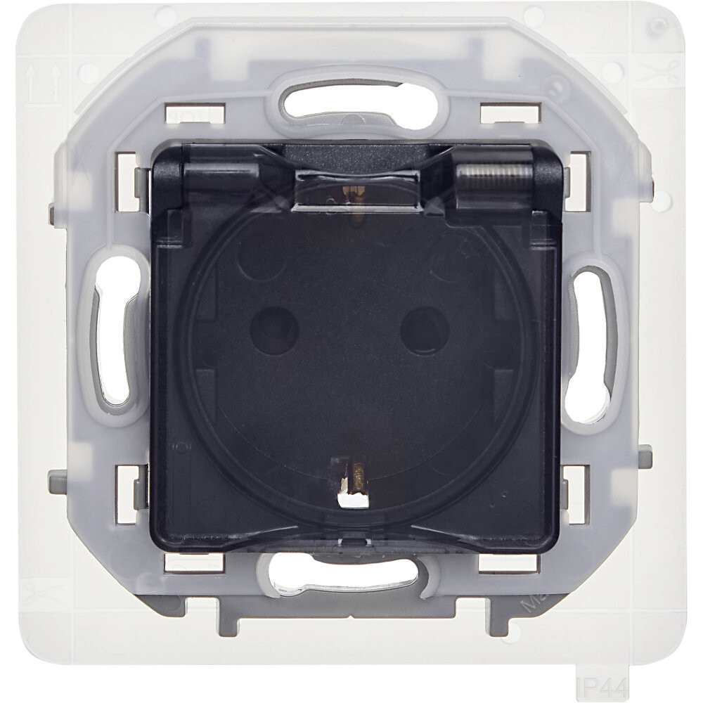 Розетка с заземлением, защитной крышкой и интегрированными защитными шторками для скрытого монтажа Inspiria, степень пылевлагозащиты IP44, цвет ''Антрацит'', номинальный ток 16А, напряжение ~250В, максимальная мощность 3680 Вт, винтовые зажимы. Применяется для присоединения однофазных электрических потребителей к сети переменного тока в зданиях с проводкой с заземлением (с защитным проводником). Предназначена для установки в местах с повышенной влажностью. Оснащена интегрированными шторками, которые защищают детей и других пользователей от удара электрическим током.