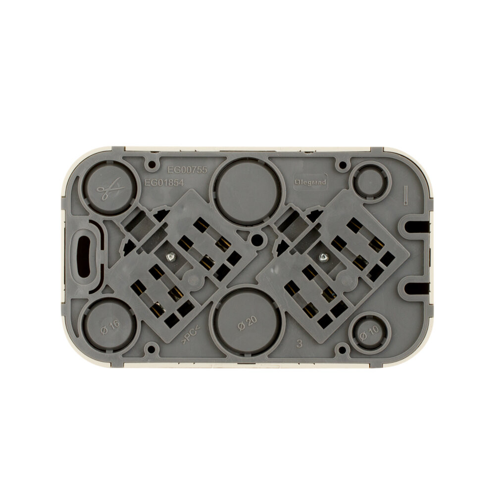 - Преимущества: Современный формат накладного монтажа|Механизм изготовлен из высококачественного поликарбоната, не проводит электрический ток, не поддерживает горение|Простое выравнивание изделий при установке в ряд, благодаря специальной форме основания|Корпус ударопрочный из пластичного полипропилена, стойкого к внешним воздействиям|Перфорация на корпусе для безошибочного вырезания отверстий при монтаже открытой проводки|В основании преднарезаны 4 отверстия для подвода кабеля при монтаже скрытой проводки