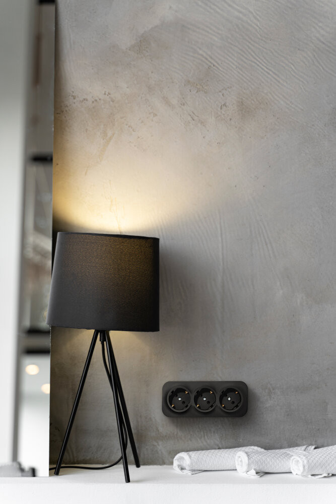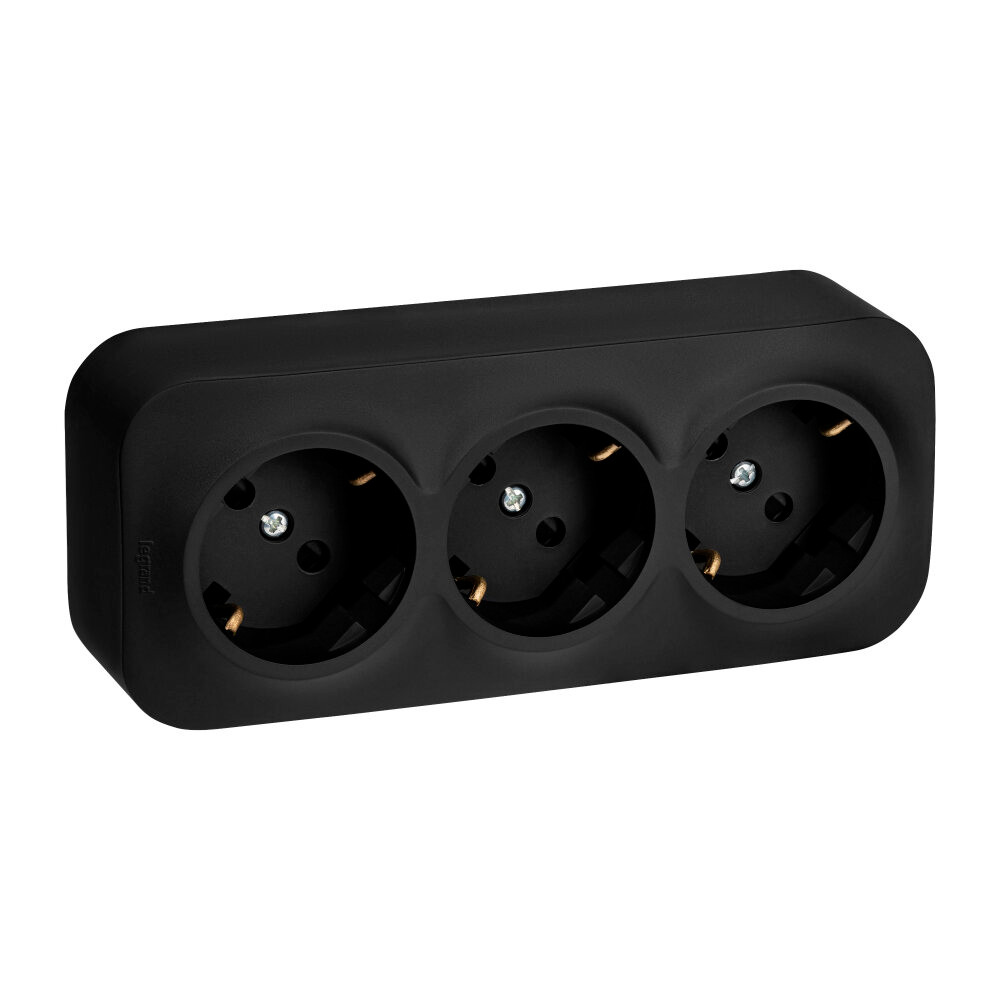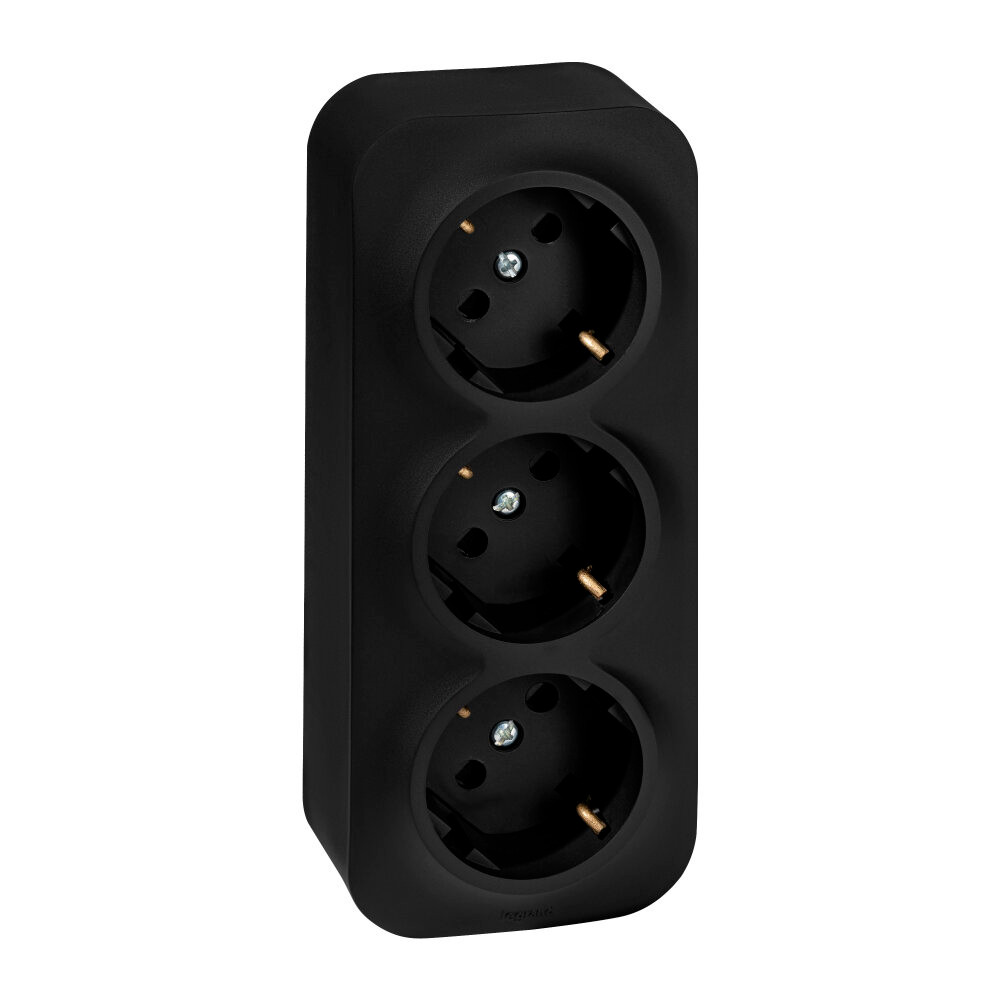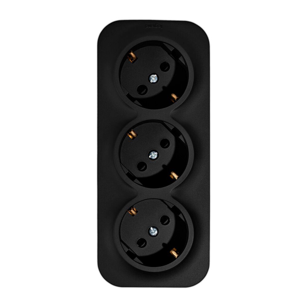 Полное описание товара Розетка 3-местная для открытой установки с заземлением с защитными шторками с предварительным подключением 16А черный матовый QUTEO (IEK) 782473