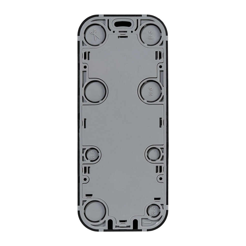- Преимущества: Современный формат накладного монтажа|Механизм изготовлен из высококачественного поликарбоната, не проводит электрический ток, не поддерживает горение|Простое выравнивание изделий при установке в ряд, благодаря специальной форме основания|Корпус ударопрочный из пластичного полипропилена, стойкого к внешним воздействиям|Перфорация на корпусе для безошибочного вырезания отверстий при монтаже открытой проводки|В основании преднарезаны 4 отверстия для подвода кабеля при монтаже скрытой проводки