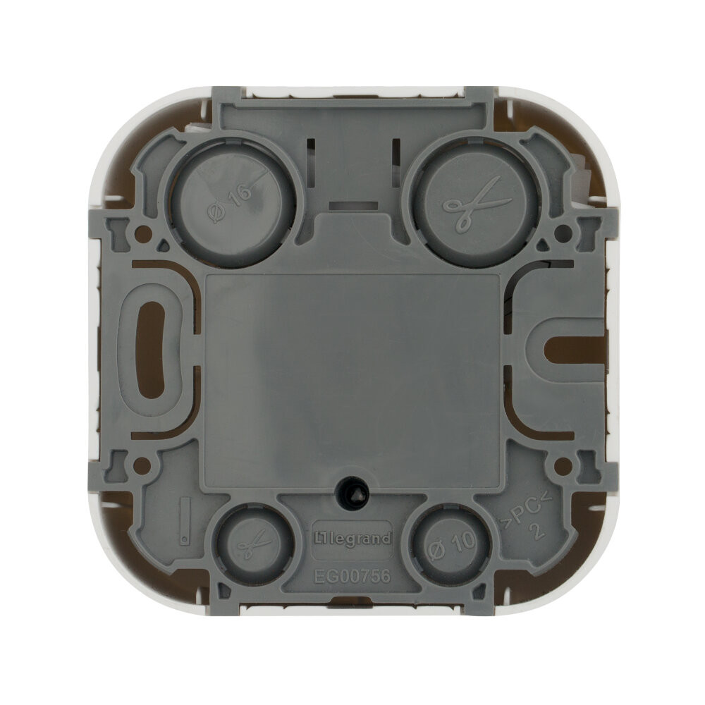 - Преимущества: Современный формат накладного монтажа|Механизм изготовлен из высококачественного поликарбоната, не проводит электрический ток, не поддерживает горение|Простое выравнивание изделий при установке в ряд, благодаря специальной форме основания|Корпус ударопрочный из пластичного полипропилена, стойкого к внешним воздействиям|Перфорация на корпусе для безошибочного вырезания отверстий при монтаже открытой проводки|В основании преднарезаны 4 отверстия для подвода кабеля при монтаже скрытой проводки
