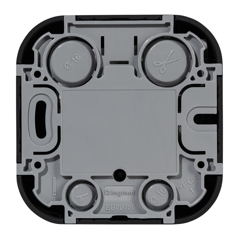 - Преимущества: Современный формат накладного монтажа|Механизм изготовлен из высококачественного поликарбоната, не проводит электрический ток, не поддерживает горение|Простое выравнивание изделий при установке в ряд, благодаря специальной форме основания|Корпус ударопрочный из пластичного полипропилена, стойкого к внешним воздействиям|Перфорация на корпусе для безошибочного вырезания отверстий при монтаже открытой проводки|В основании преднарезаны 4 отверстия для подвода кабеля при монтаже скрытой проводки