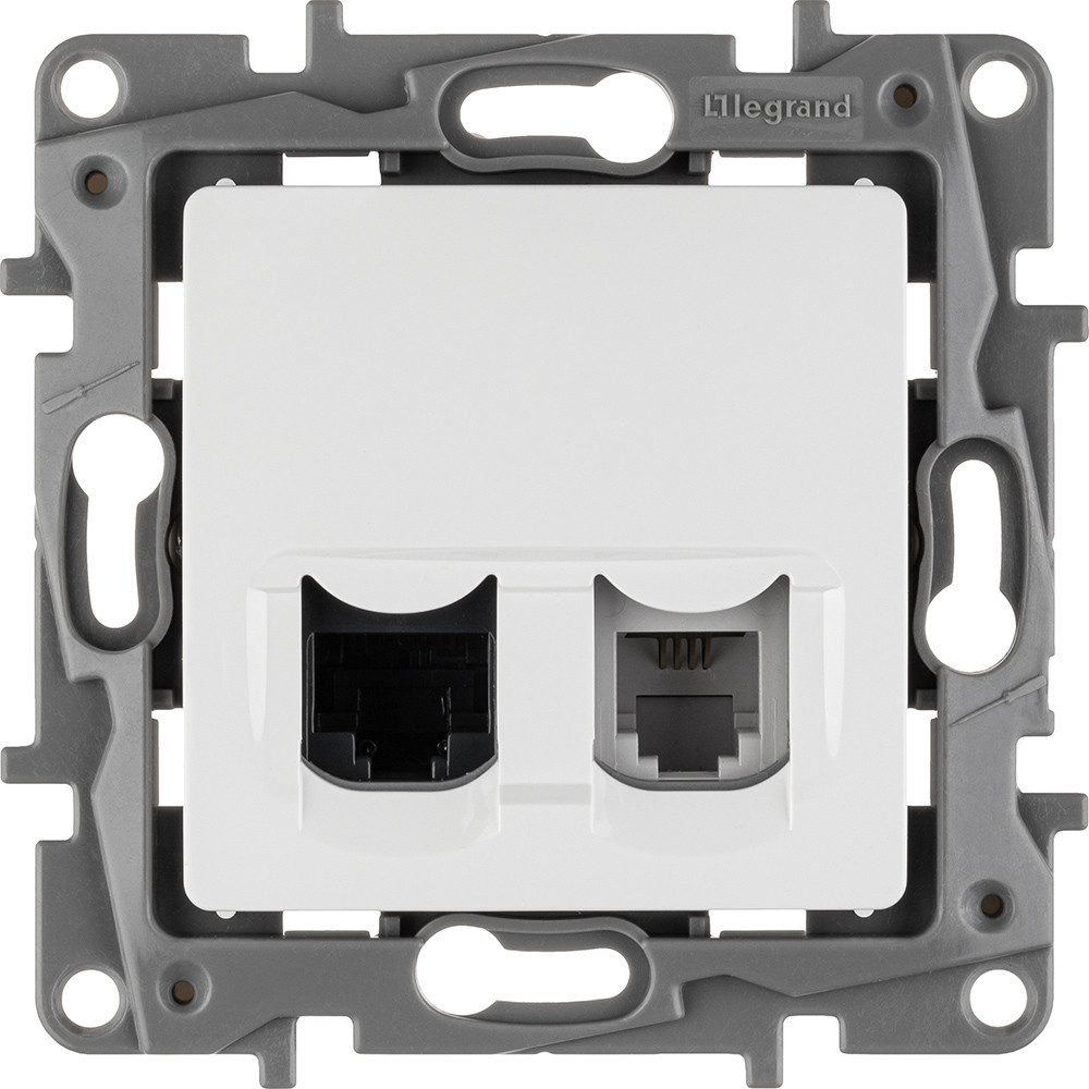 Мультимедийная розетка телефонная + компьютерная RJ11 + RJ45 UTP ETIKA, для скрытого монтажа. Служит для быстрого подключения к сетям телекоммуникаций (например, к телефонным сетям общего пользования) и персональных компьютеров к информационным сетям категории 5e.