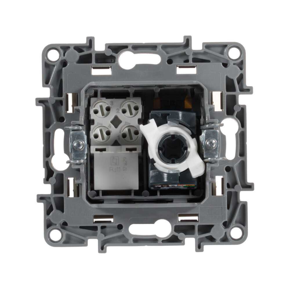 Мультимедийная розетка телефонная + компьютерная RJ11 + RJ45 UTP ETIKA, для скрытого монтажа. Служит для быстрого подключения к сетям телекоммуникаций (например, к телефонным сетям общего пользования) и персональных компьютеров к информационным сетям категории 5e.
