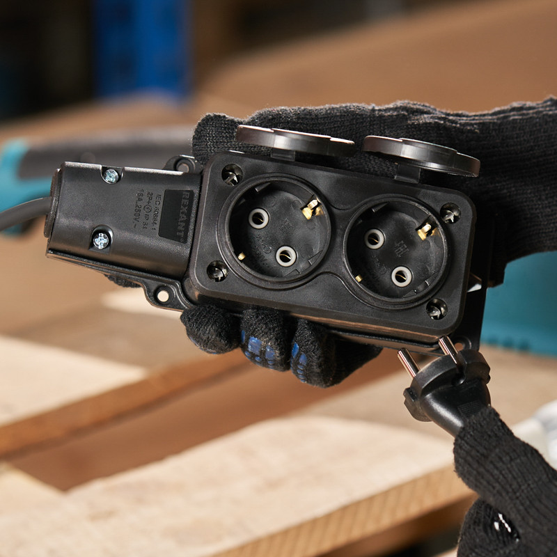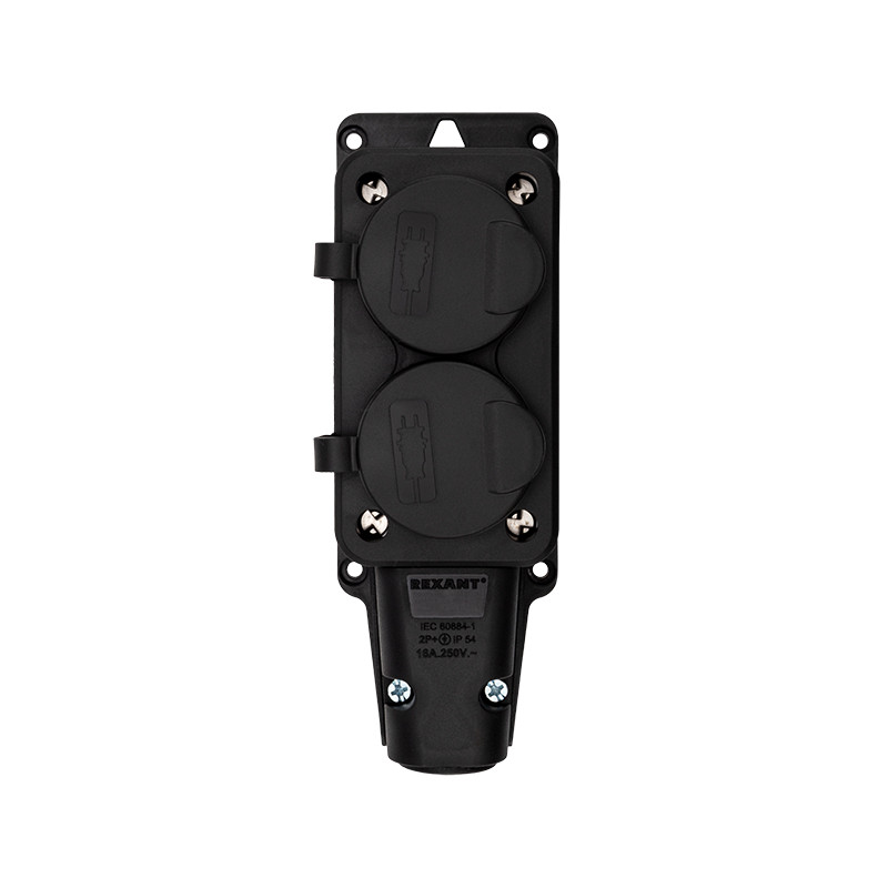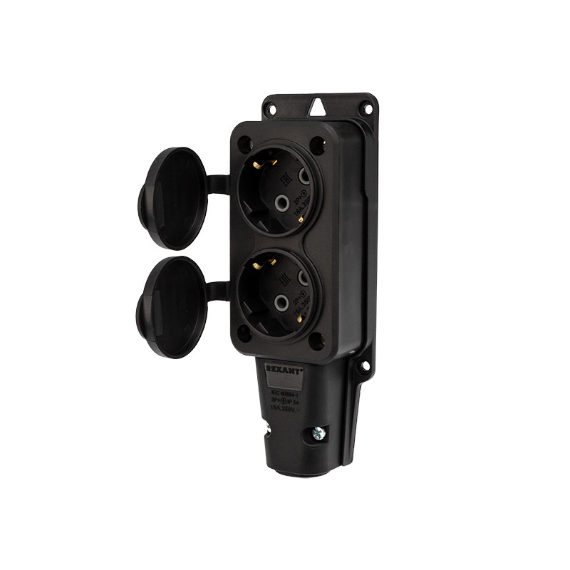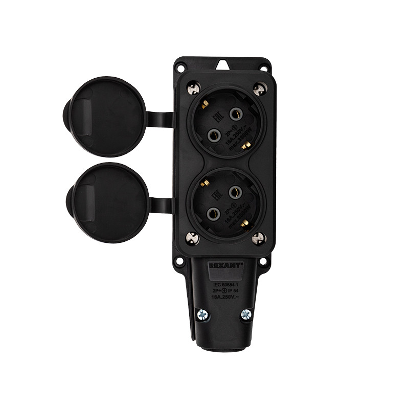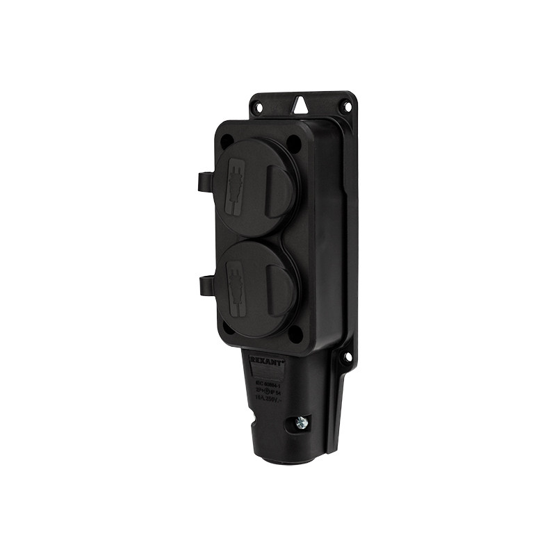 Полное описание товара Розетка (колодка) каучук двойная 16А, IP54 с заземлением черная (REXANT) 111-112