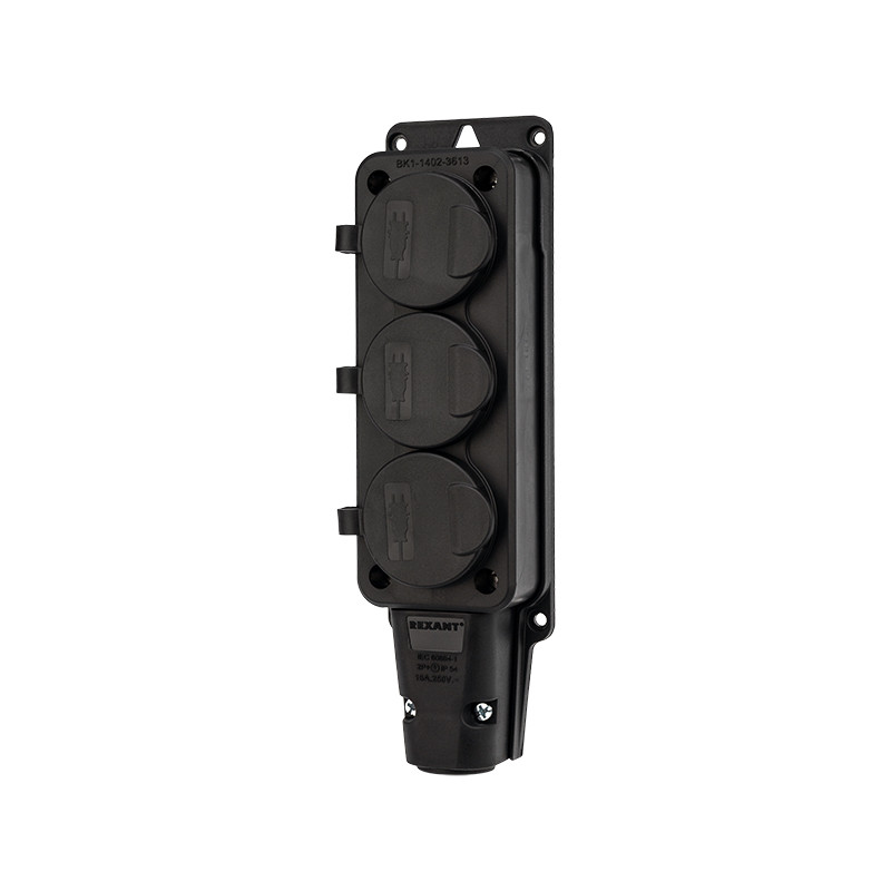 Полное описание товара Розетка (колодка) каучук тройная 16А с заземлением IP54 черная (REXANT) 111-113