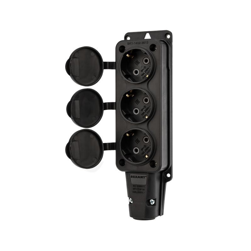 Розетка (колодка) каучук тройная 16А с заземлением IP54 черная (REXANT) 111-113
