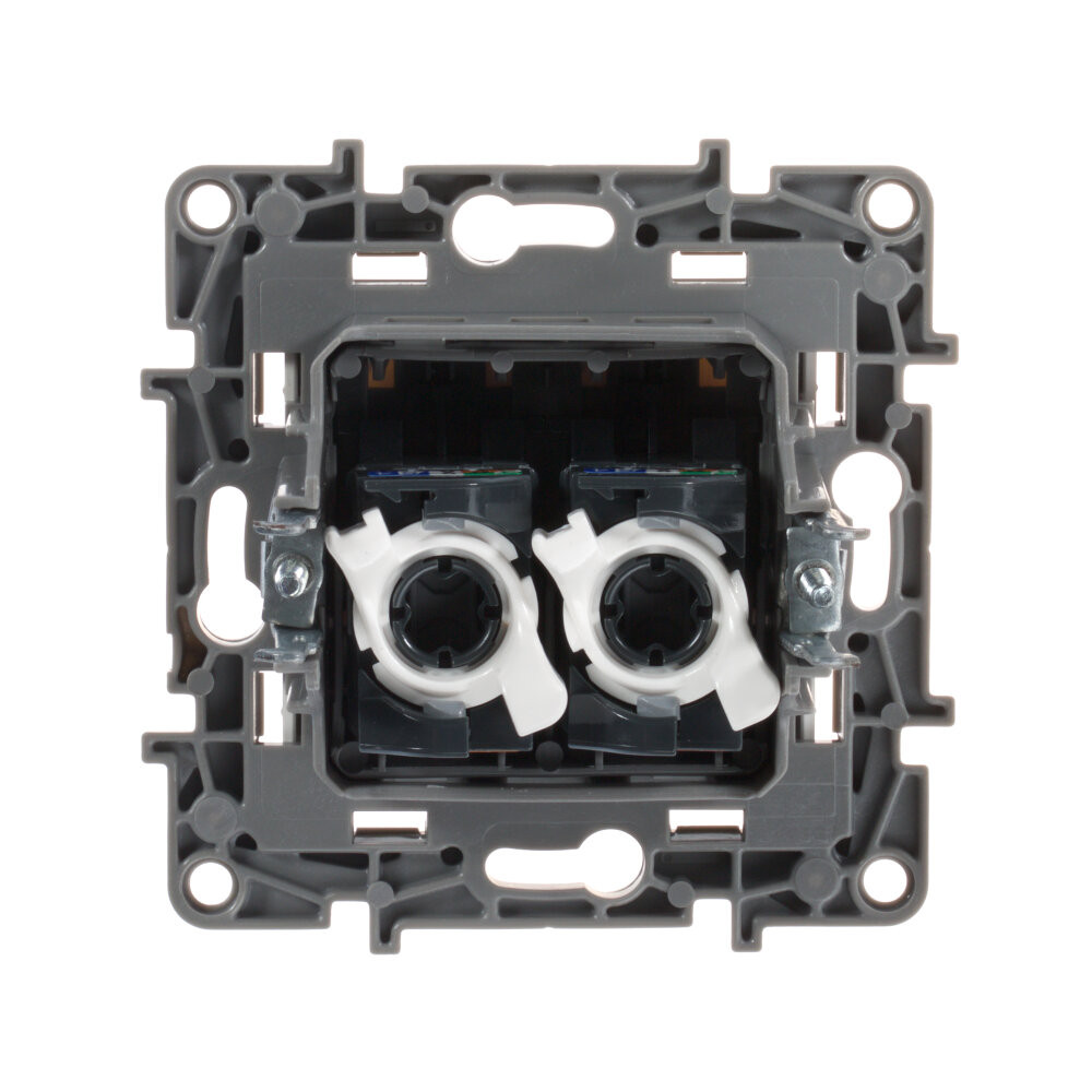 Розетка двойная компьютерная (информационная) ETIKA RJ45 UTP скрытого монтажа. Предназначена для быстрого подключения персональных компьютеров к информационным сетям категории 5Е.