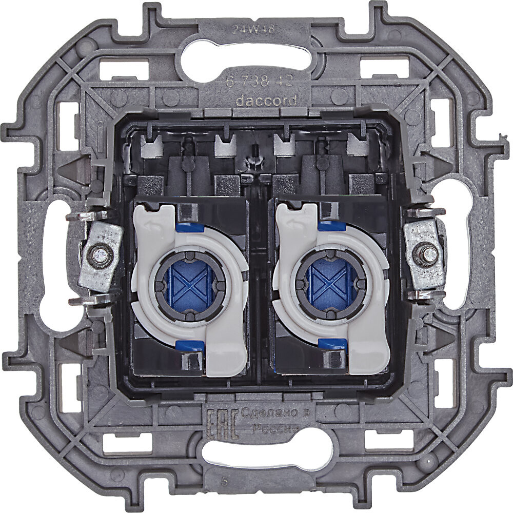 - Преимущества: Присоединение информационного кабеля к розетке не требует специального инструмента, что значительно ускоряет процесс подключения и монтажа|Особая конструкция коннектора позволяет при необходимости произвести до 5 циклов повторного присоединения проводников|Двойная цветовая кодировка контактов коннектора обеспечивают быстрый и безошибочный монтаж|Распределение жил под углом 90 градусов обеспечивает наилучшее качество передачи данных|Расстояние 13 мм между витыми парами гарантирует защиту от пробоя|Механизмы совместимы с разъемами RJ45 и RJ11 и могут эффективно применяться как в высокоскоростных сетях профессионального назначения, так и в домашних компьютерных сетях|Лицевая панель изготовлена из качественного пластика АБС, устойчивого к загрязнению и воздействию УФ-излучения|Корпус механизма - высококачественный поликарбонат: обладает высокой прочностью, электробезопасностью, термостабильностью и не поддерживает горение