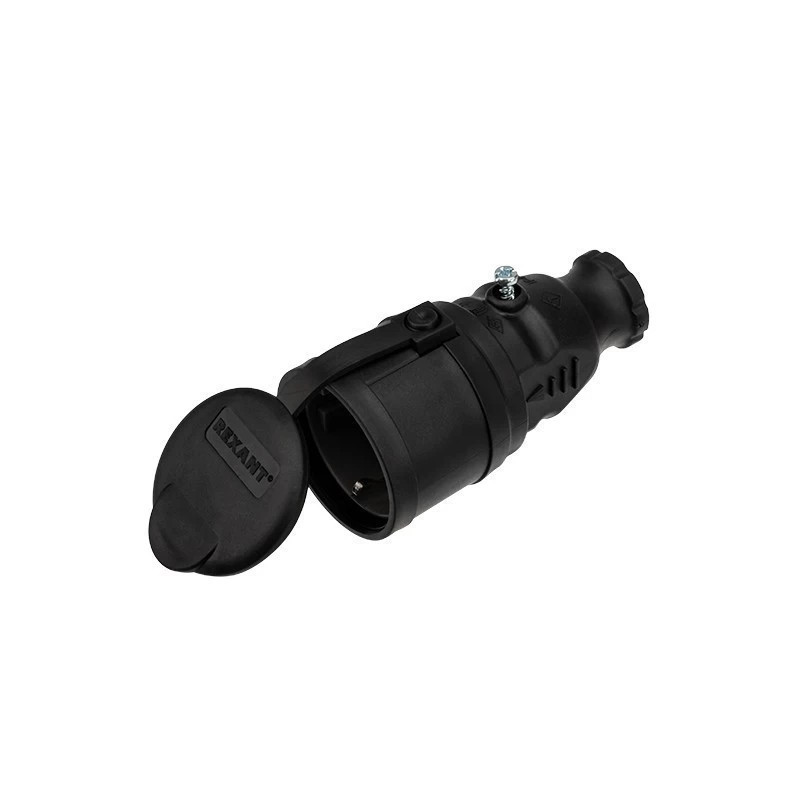 Розетка переносная с защитной крышкой каучук 16А IP44 черная (REXANT) 111-004
