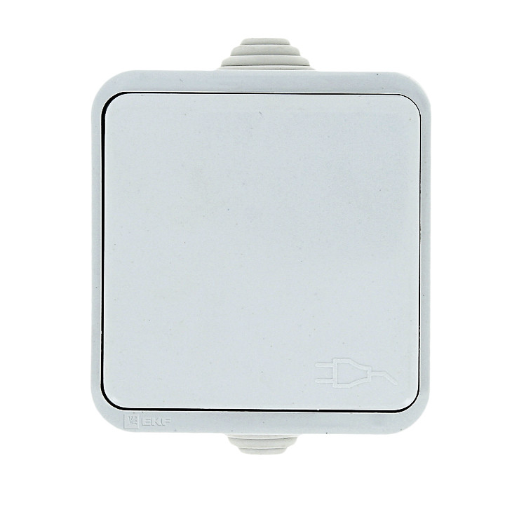 Полное описание товара Розетка Прага 1-местная 16А с заземлением с крышкой IP44 белая с защитными шторками (EKF) EKR16-029-10-440