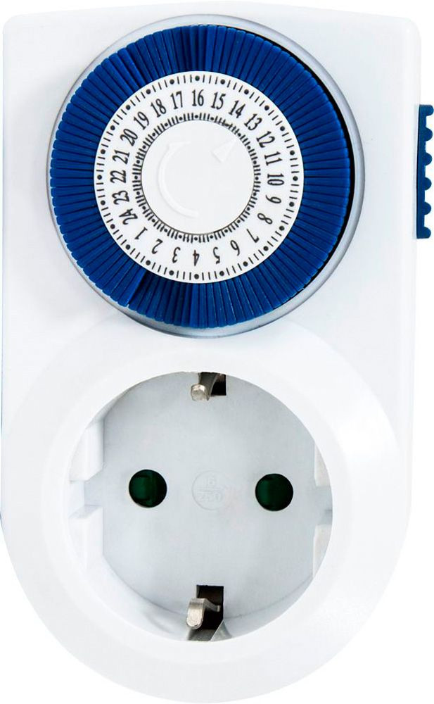 Розетка с таймером - электромеханическое суточное реле со шкалой времени с функцией циклического повторения установленных программ. Прибор предназначен для коммутации цепей переменного тока с номинальным напряжением 220-240В и частотой 50Гц. Используется для автоматического исполнения программ включения/выключения электроприборов в суточном цикле.